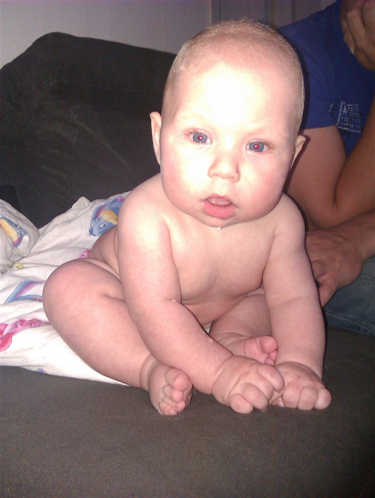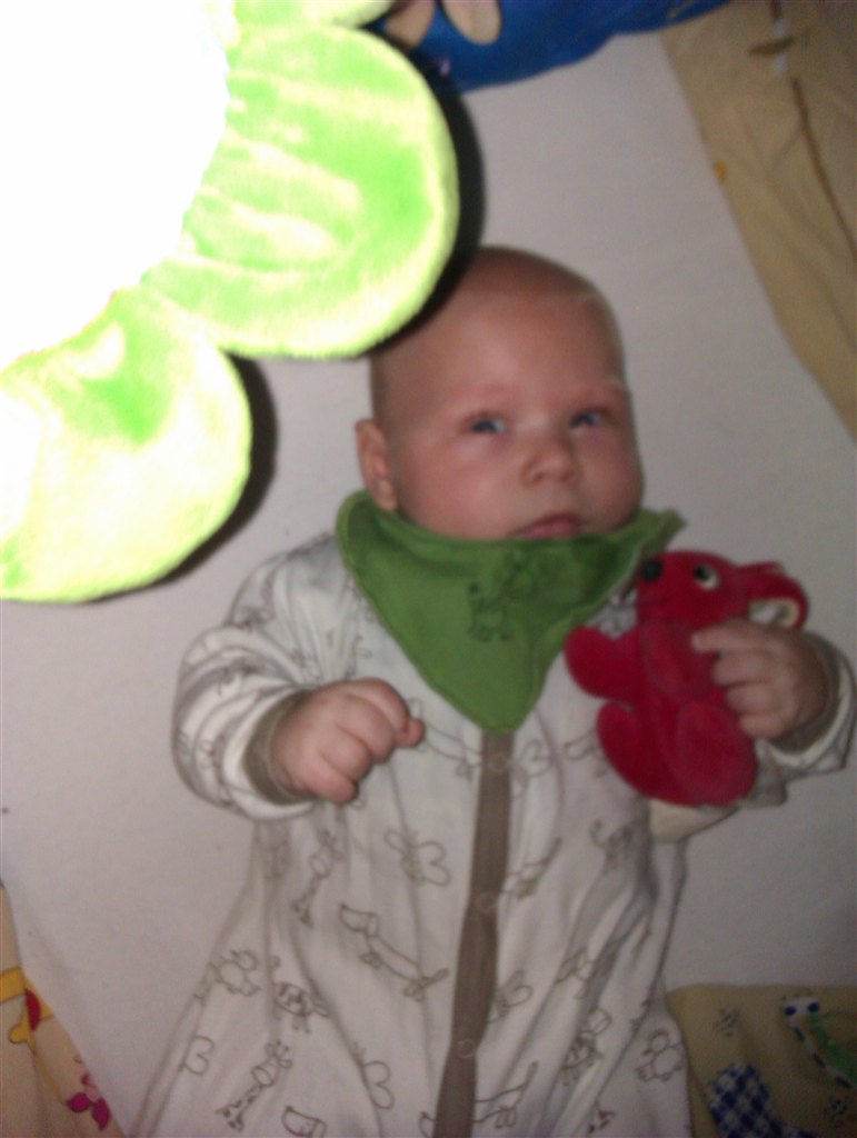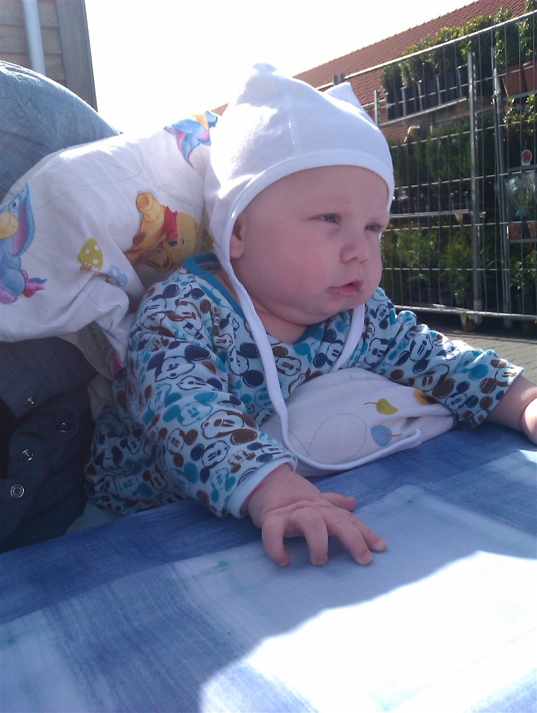 Han kan sidde selv, trille selv, begynde og samle benene op under maven, bakke en lille smule selv, spise grød, mos, rugbrød .. Ja sådan set ALT...