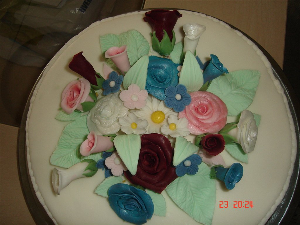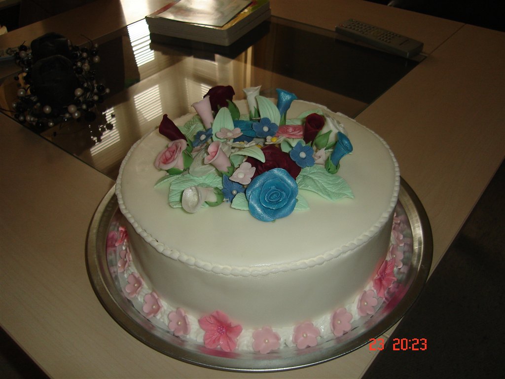 msaabyhp skriver: hj lavet lagkage bunde, jordbær mousse med friske jorbær ovenpå, rutebil creme, smurt op med PSC, overtrukket og pyntet med fondant.