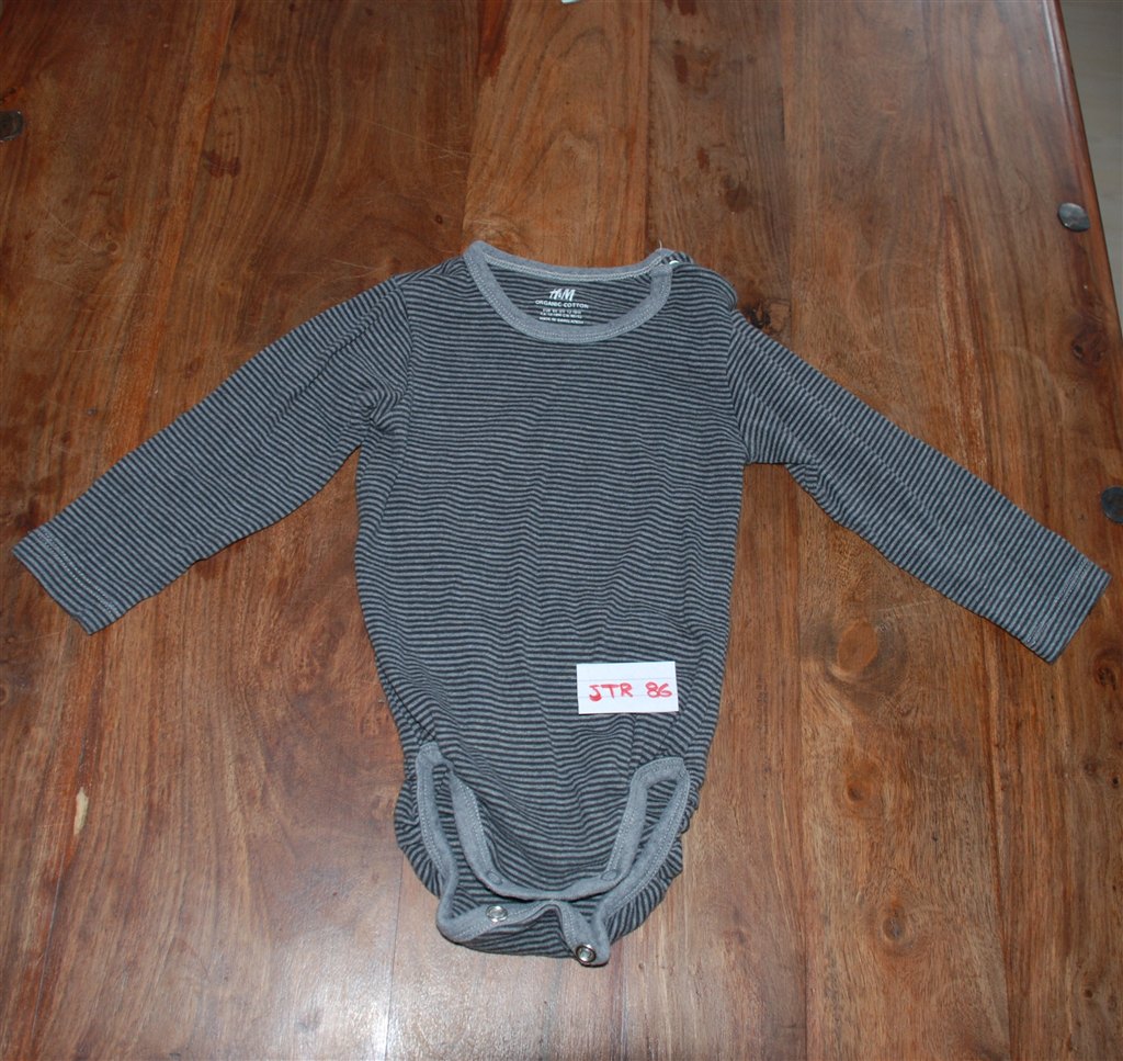Billed 7: Mørke går og lysegrå stribet body. Str. 86. Mærke: h&m