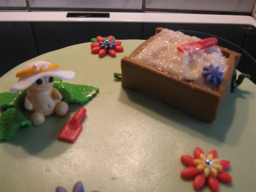 Kagen består af vanillebunde m. tobleronecreme og hindbærmousse. Derudover er det et lille stykke chokoladekage i sandkassen.