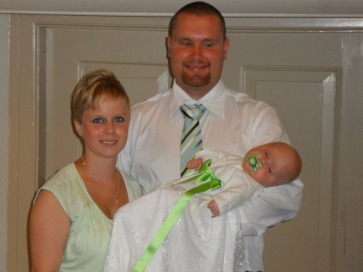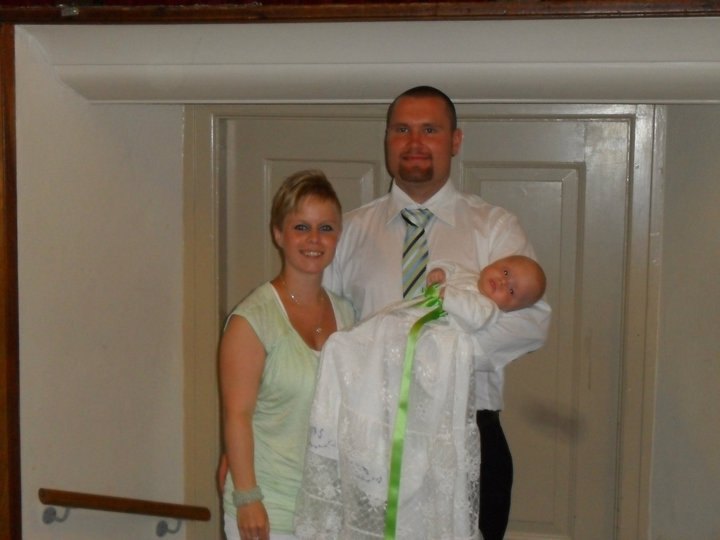 Min søster var gudmor til storm - kærestens bror var fadder og vores fælles bedste ven - Storm græd lidt løbede af dagen, men ellers klaret han det så flot .. er så stolt af ham .. vi var 61 mennesker til hans dåb et enkel billede af den lykkelige familie - hele festen var i lime grøn , pynt osv hihi - så floot og en helt fantastisk dag med massere af gaver