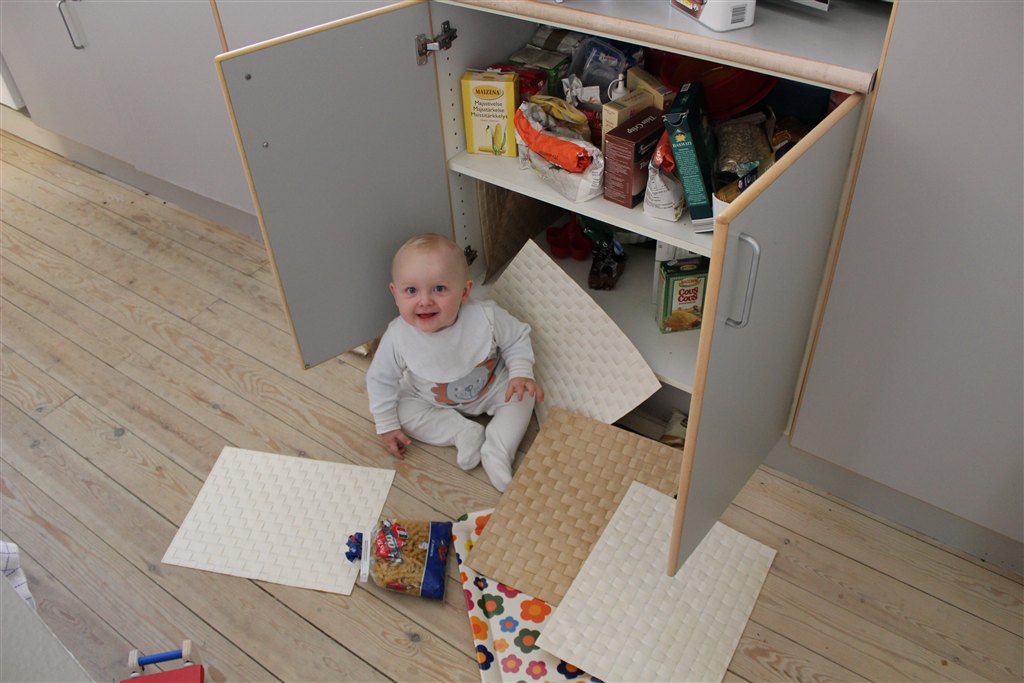 Han er begyndt at kravle (startede i går, og hvor ser det kært ud!) Han rejser sig op af ALT, hvad han kan komme i nærheden af, og elsker bare at udforske det hele herhjemme