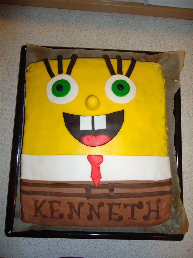 Så fik jeg kastet mig ud i 3. kage da vi skal til fødselsdag i morgen hos en som elsker svampe-Bob så tænkte at det ville jeg lige prøve om det kunne ligne bare en lille smugle...synes selv han er blevet nogenlunde ok...havde dog glemt at få købt blå pastafarve til øjnene så de er altså derfor blevet grønne istedet...