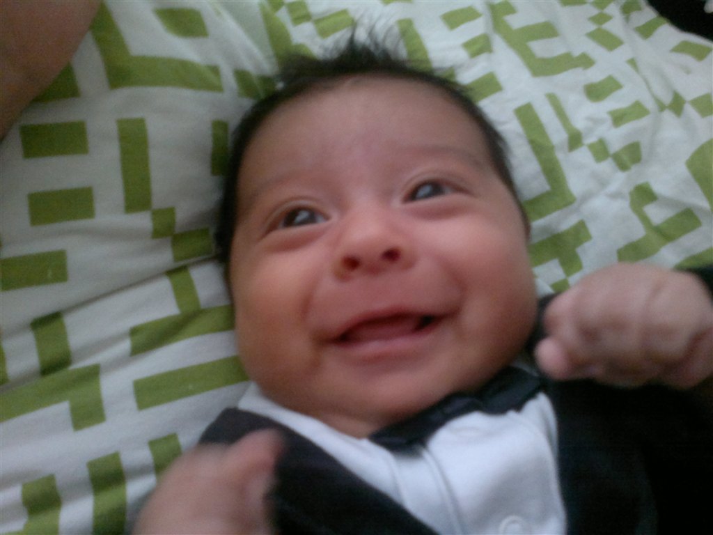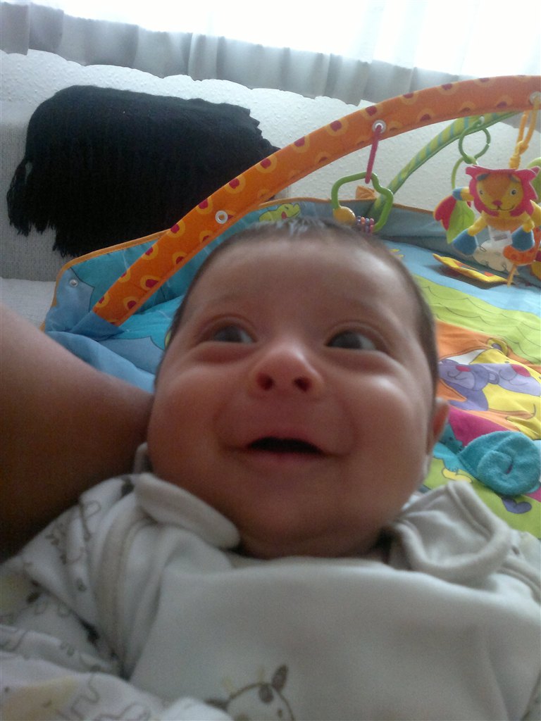 Han er en meget nysgerrig dreng og vil gerne rundt omkring og kigge. Han kan løfte sit hoved i ca.3 min. og også kigge til siderne. Han er begyndt at smile bevidst og så snakker han såå meget- det er så vidunderligt.