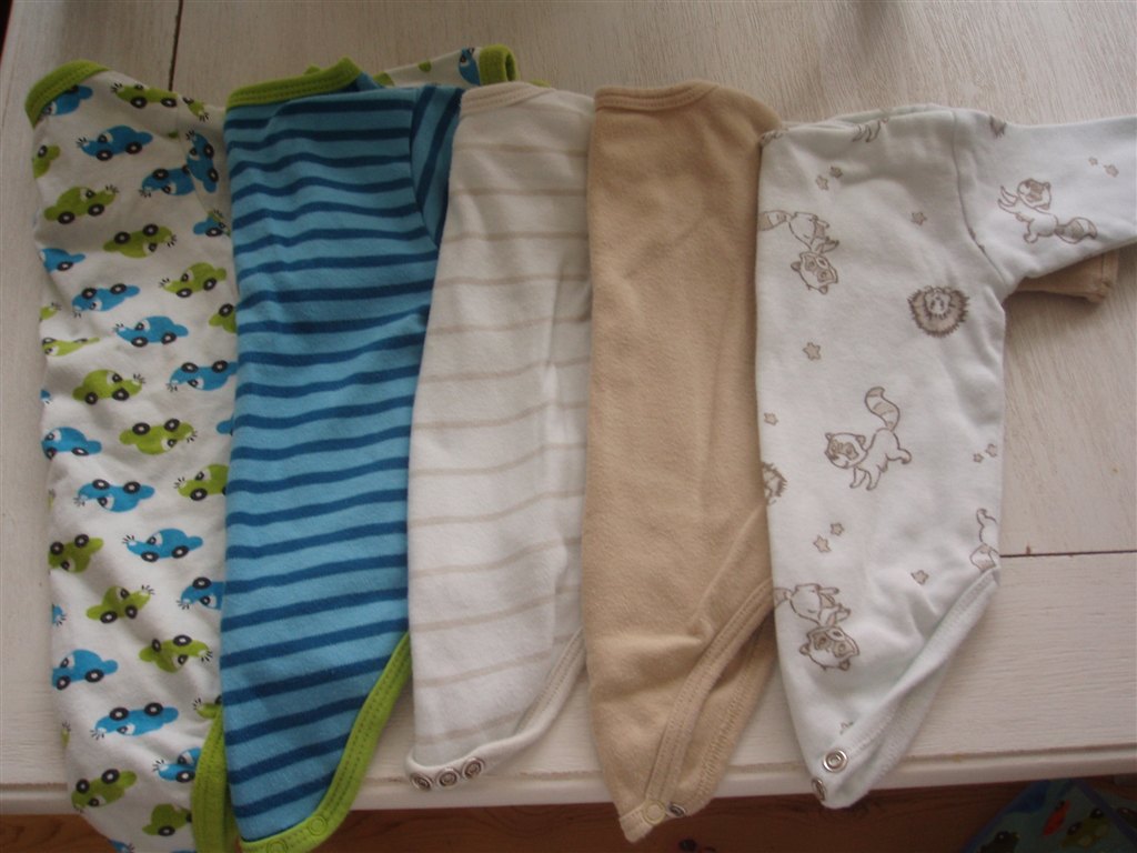 Der er to par smækbukser i brun fra H&M, str. 56 og 62. Derudover er der 5 langærmede bodyer i str. 56.