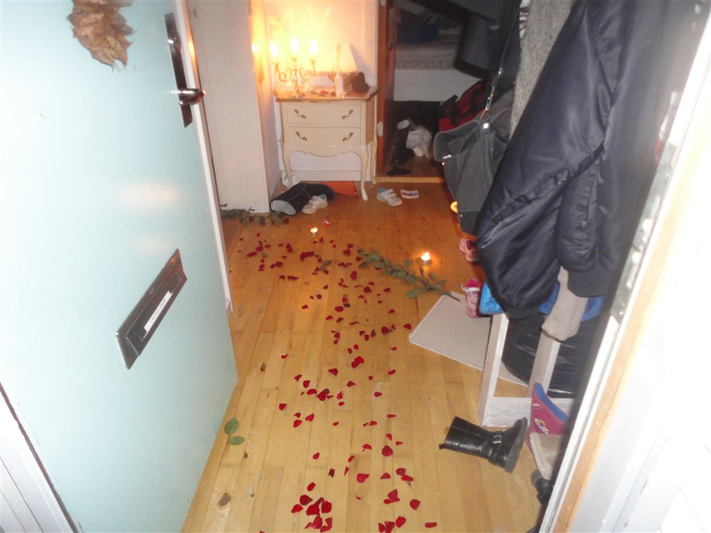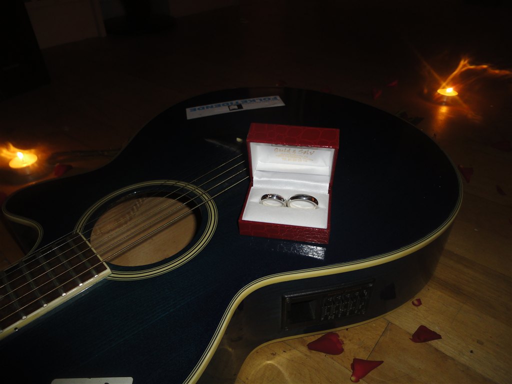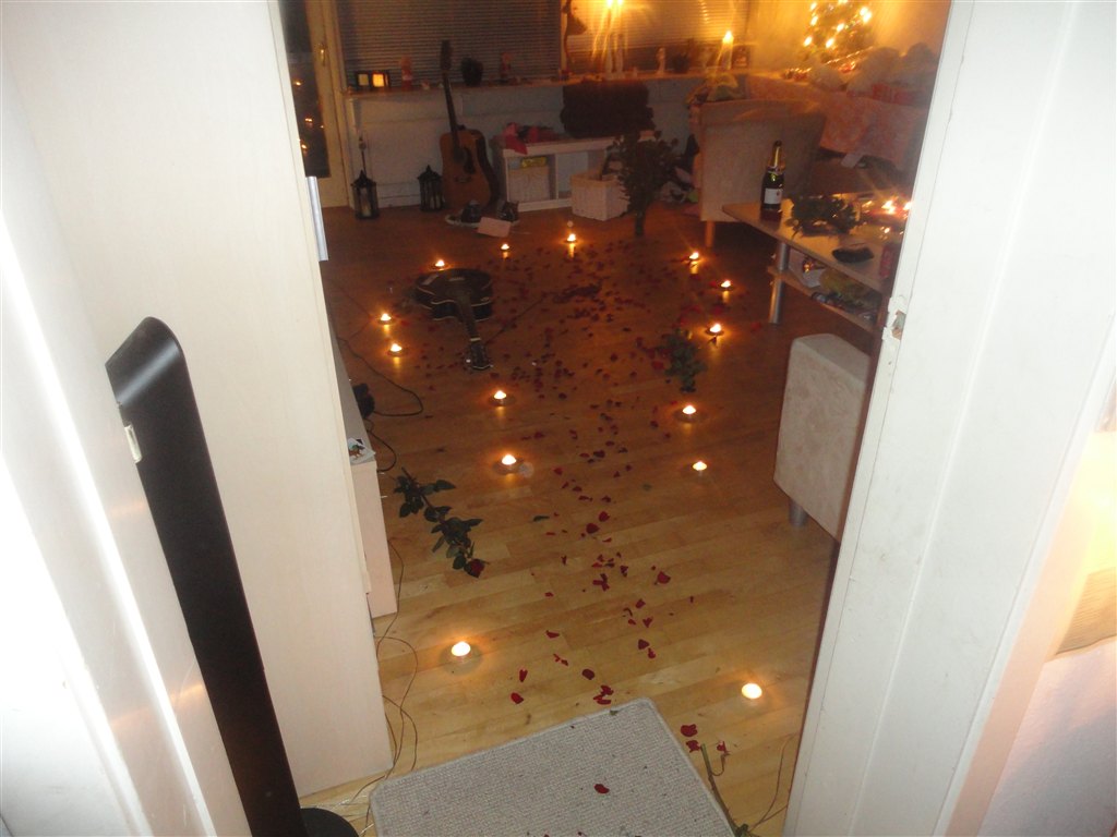 Vi havde inviteret familien til kaffe på hans 30 års fødselsdag, og der rejste han sig op, jeg troede han ville sige tak til gæsterne eller lign. Men han gik om til mig, faldt på knæ og spurgte om jeg ville gifte mig med ham. Jeg blev helt rørt, græd og stammede ja, og så hev han en ring frem, som jeg fik på. Den var alt for stor, men det gjorde ingenting. Bare det at vide, at han havde planlagt det hele var stort for mig. Jeg var helt pjattet og rørt, græd og grinede resten af dagen.