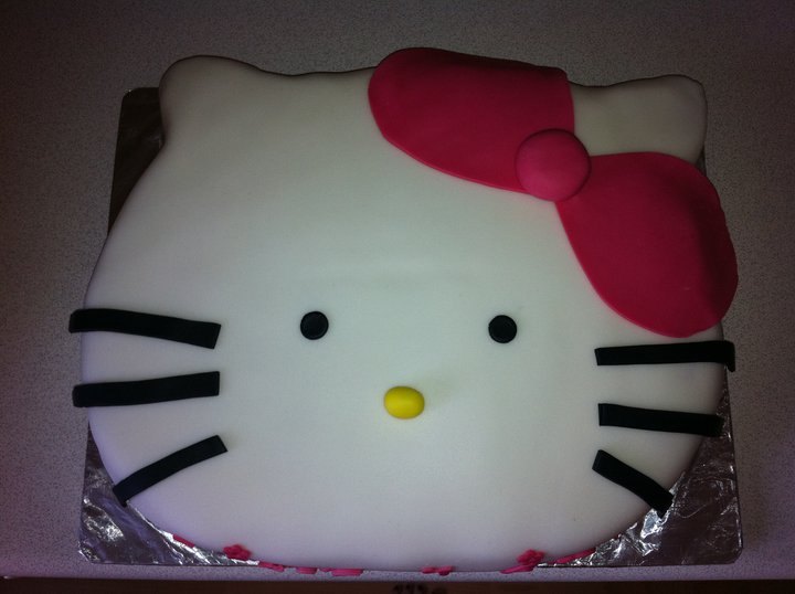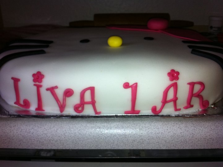 Min 7. kage..Self med Hello Kitty da det var til min datters 1 års Lyse bunde og jordbær mousse med hakket mørk chokolade med orange smag. Smurt op med PSC - pyntet med fondant.