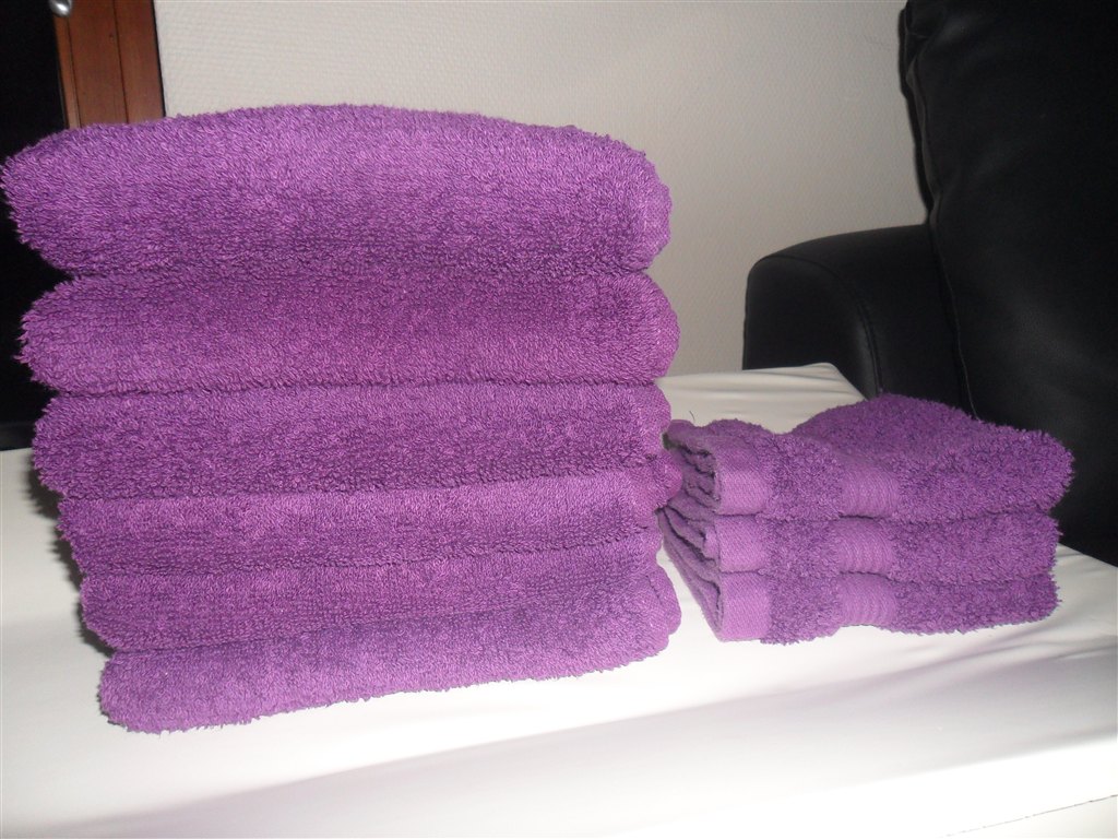 Hvid puslepude og 6 lilla små håndklæder til at ligge derpå samt 3 lilla vaskeklude