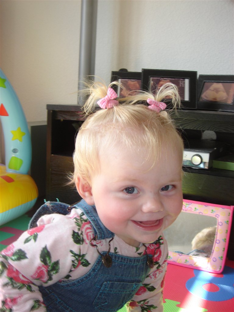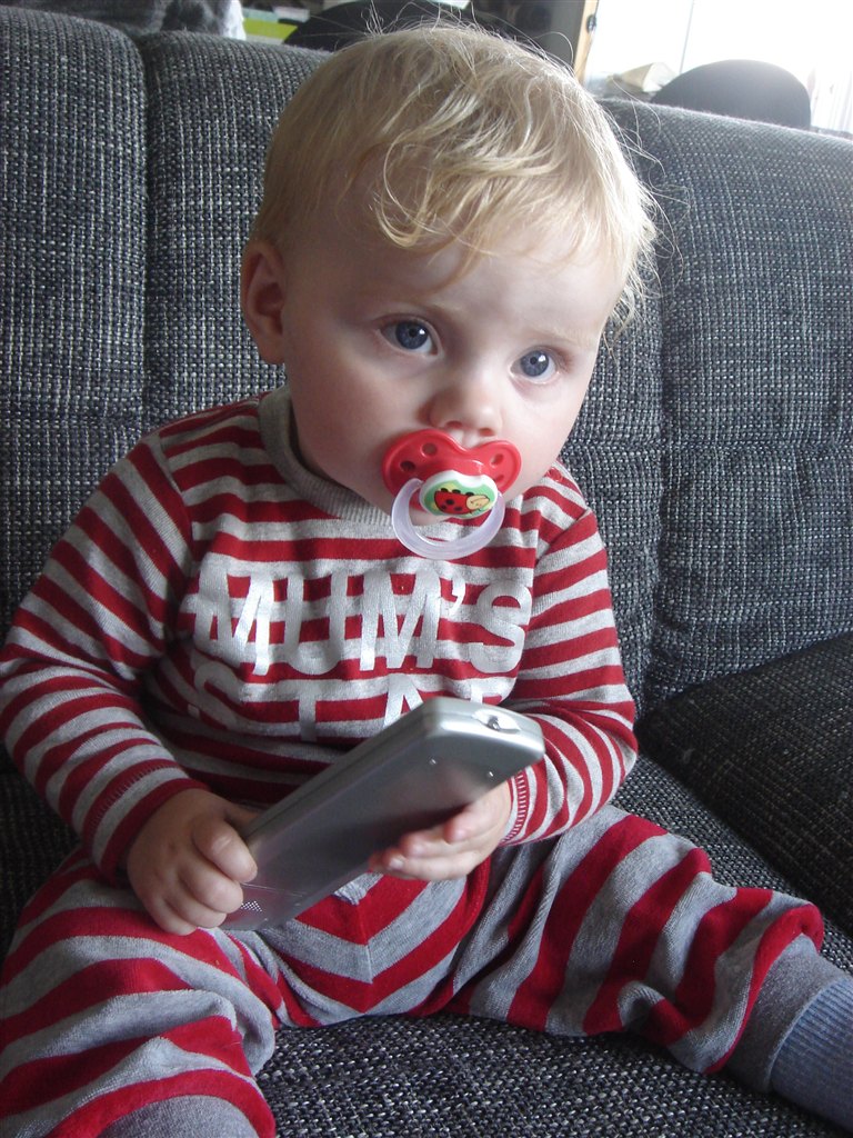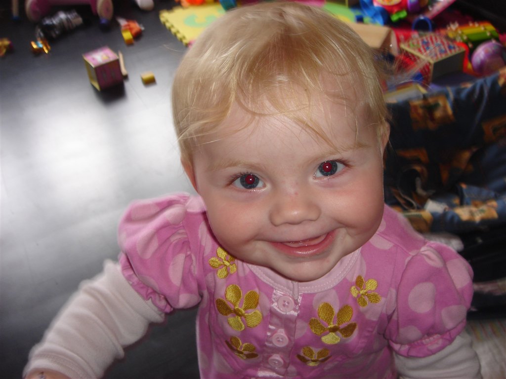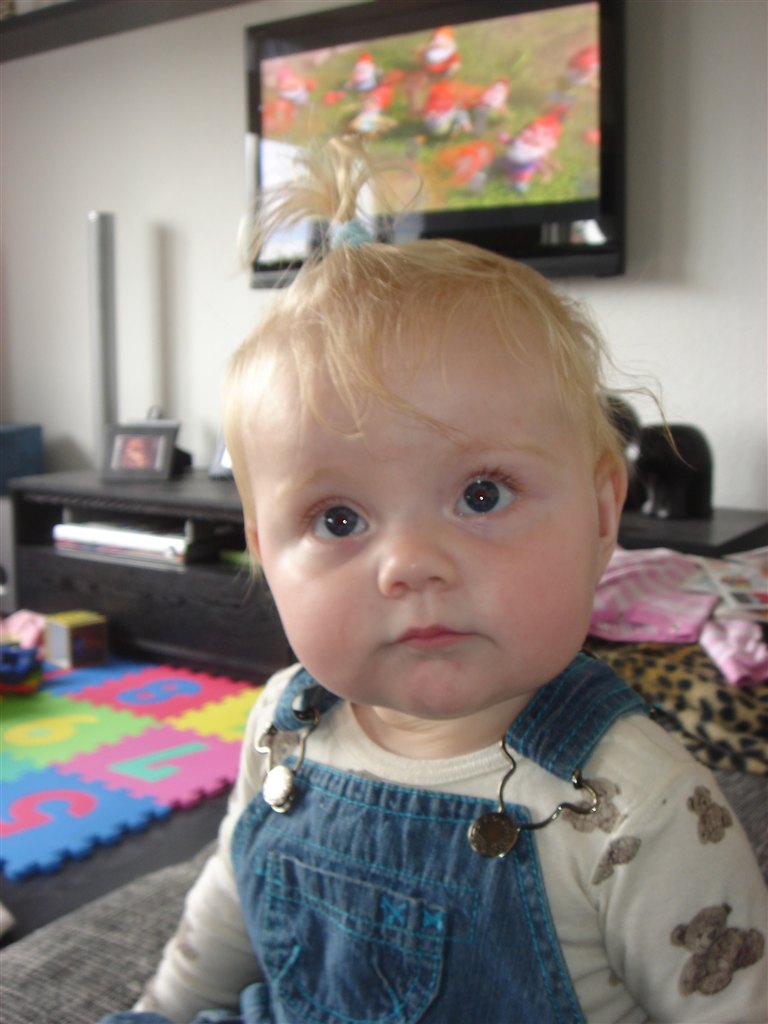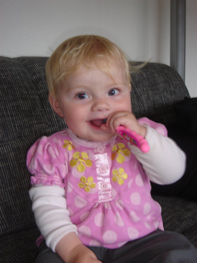 Alfebarnet har nu rundet de 10 mdr (igår). Den første lille tand er tittet frem og hun pludrer ivrigt. Hun kravler ikke rigtigt, men trækker sig frem med det ene ben (lidt svært at forklare).