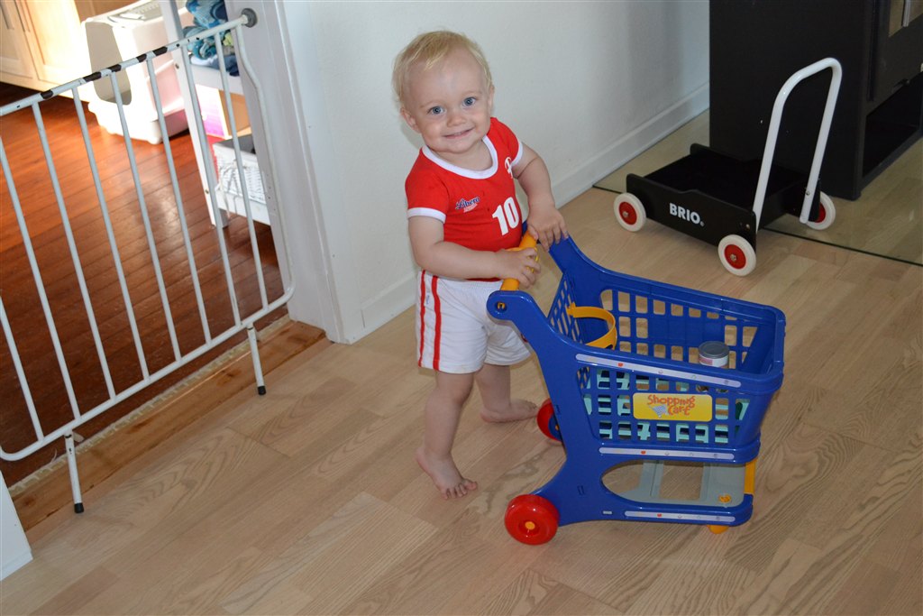 altså.. en ting jeg ved Lasse er hamrende glad for lige nu, så er det hans indkøbsvogn... Den er nem at køre rundt med, han kan ligge ting i den og den er bare så sjov..