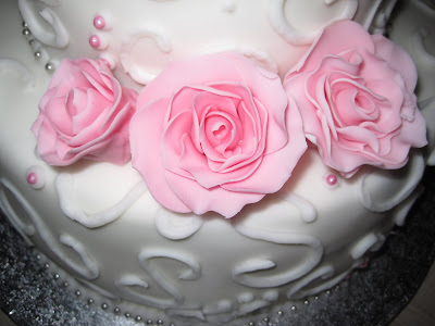 Ønsker til denne kage lød bare på at jeg skulle holde mig inden for farverne hvid, lyserød, sort og sølv. Topfiguren var et brudeparret selv have købt til kagen. Ellers var der frie hænder.