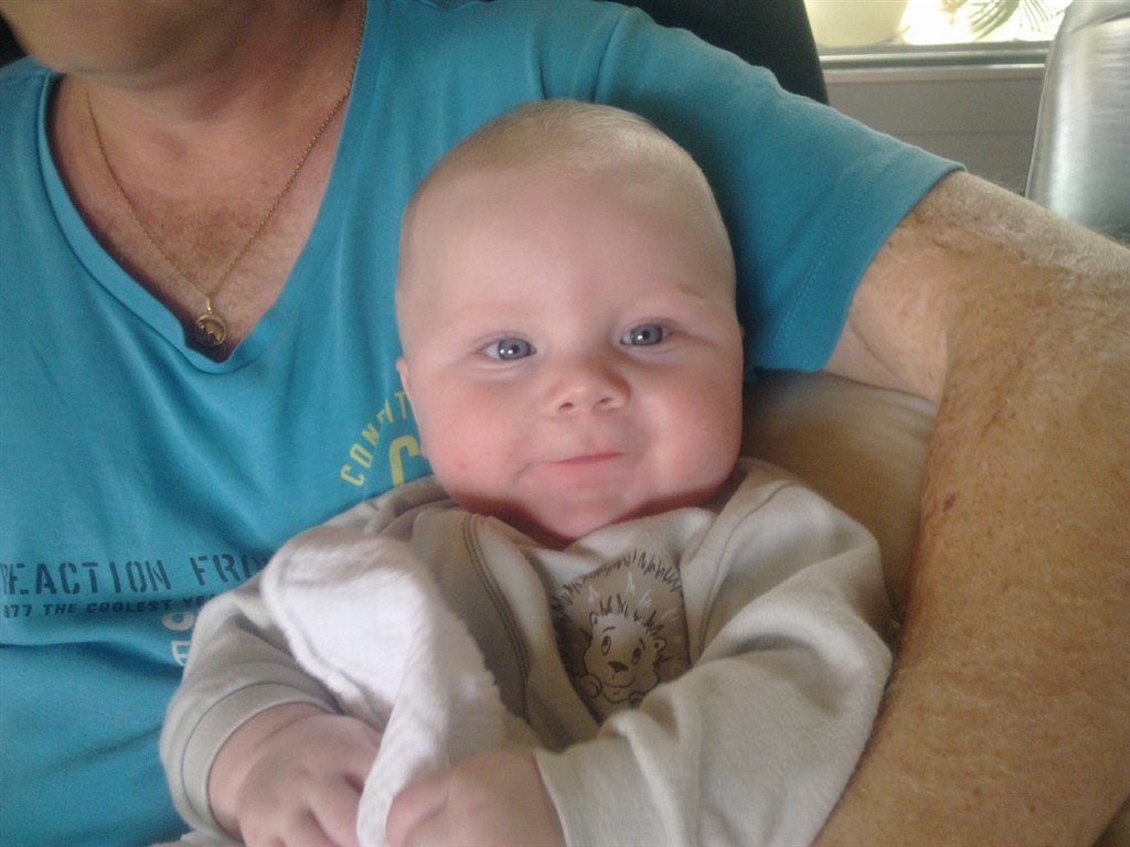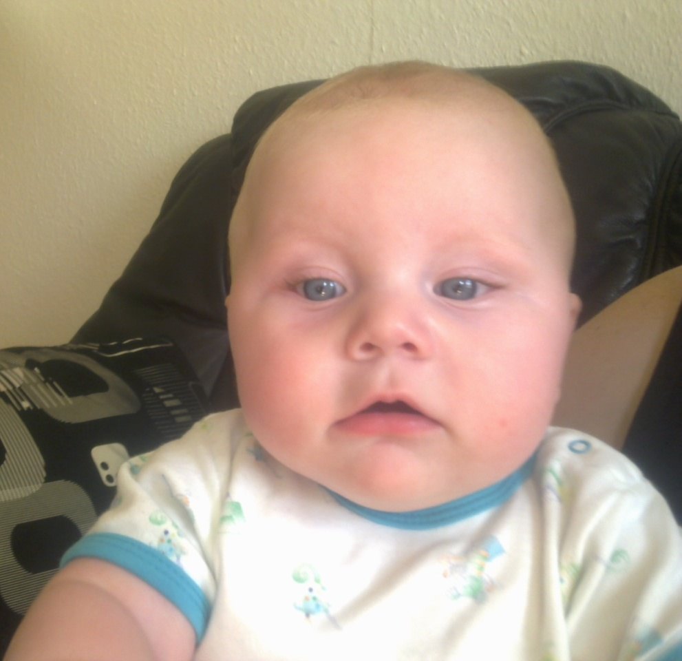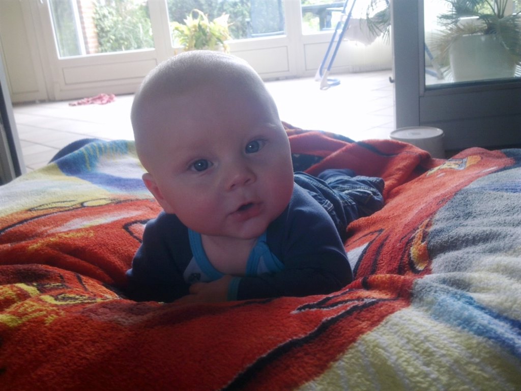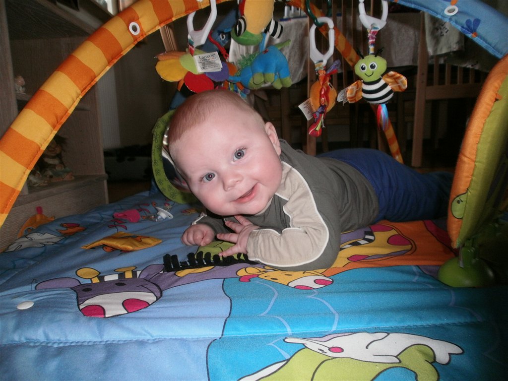 Siden sidst har han lært at trille fra ryg til mave og omvendt, det nyder han virkelig og kommer omkring på den måde, ofte ender han dog inde under spisebordet hvor han er helt stille, som om han leger gemmeleg med mor og far.
