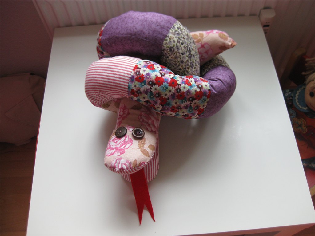 Sådan en slange har jeg også lavet , Caroline elsker den allerede Hvor har du købt det stof med græs og blomster ? ;D