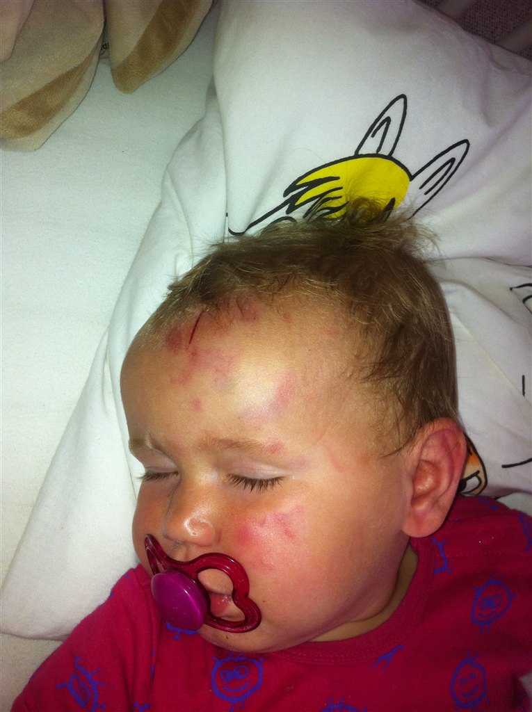 De havde været ude og gå en tur, og så havde D taget selen af hende, men hun ville lige give hende gummistøvler på før hun skulle ned, og de lå indenunder barnevognen, så da hun sætter sig ned for at ta dem, springer Matilde på hovedet ud over kanten.. Bebregter (staves) slet ikke dagplejen noget, for det kunne lige så vel være sket herhjemme, men det er da noget af en forskækkelse og få.. D er også rigtig ked af det, men børn får jo knubs engang imellem, men er da bare ked af at det er min datter der er så vild.. (Kopieret fra min tidligere tråd)