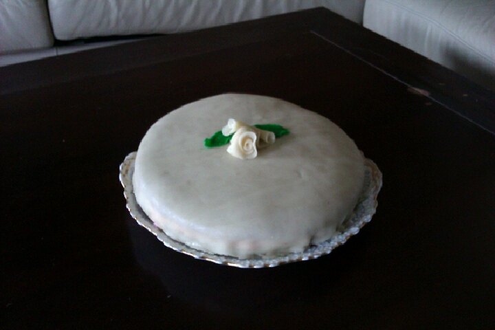 Her er billeder af min 2. kage med fondant og marcipan blanding. Med alm lagkagebunde og 1 tyk chokoladekage bund af fyld var der skovbær fromage og daim mousse. MUMS den var god