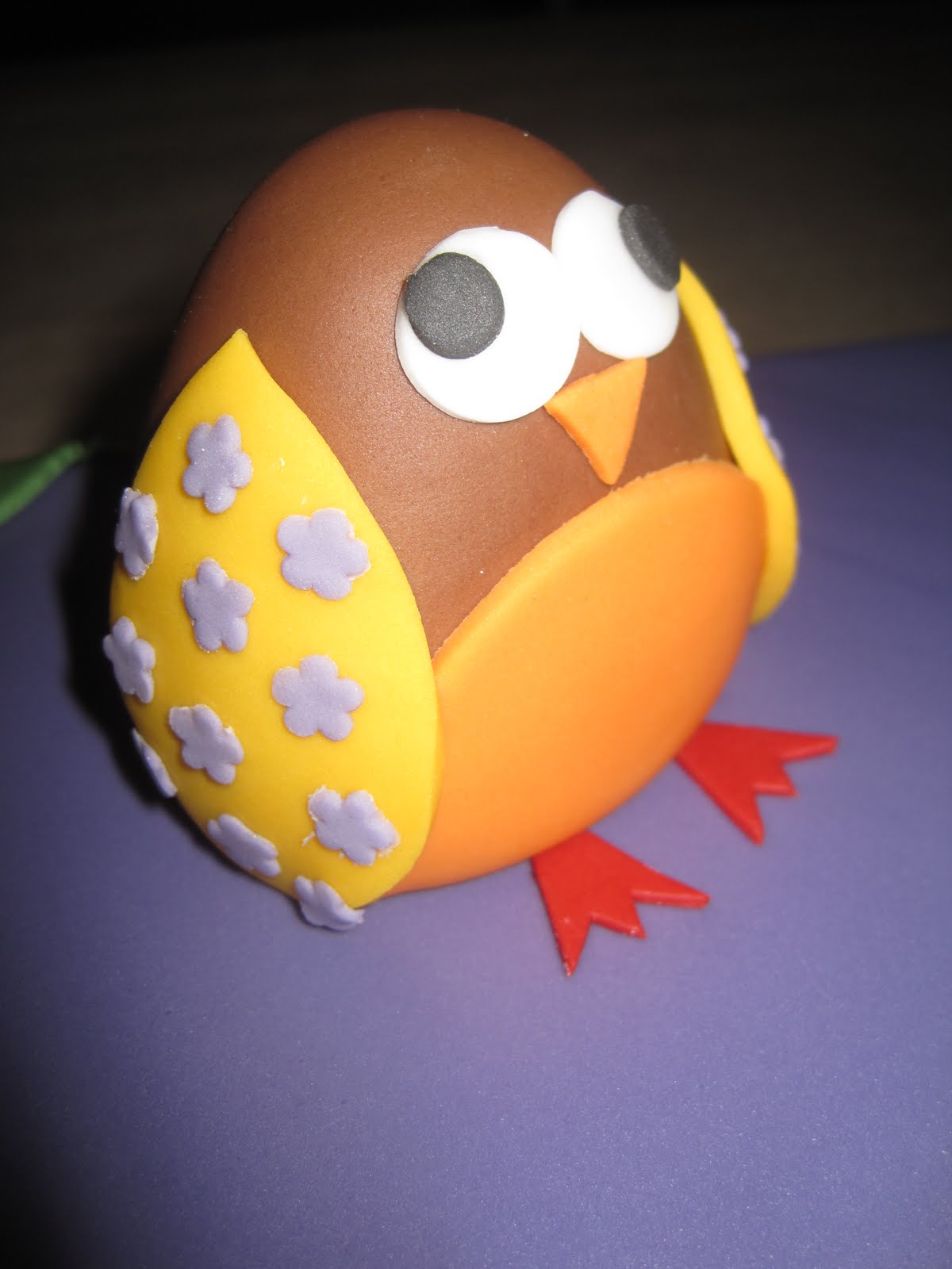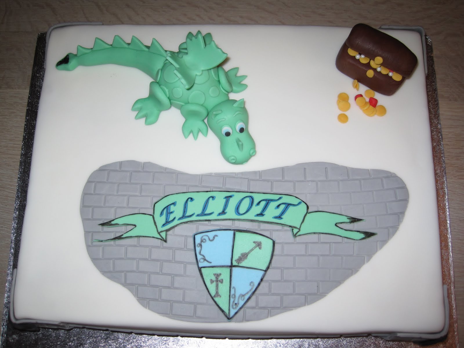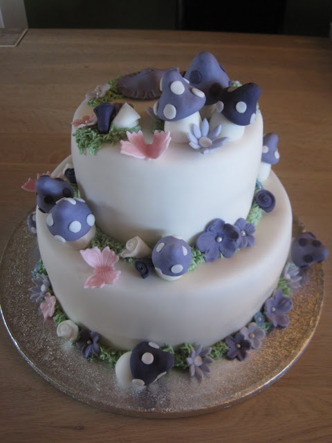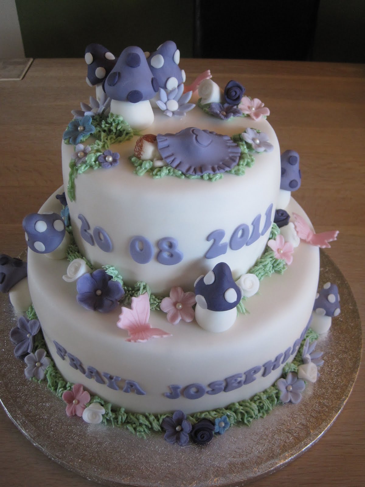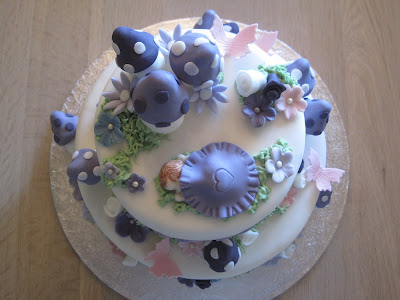 Drømmekagebunde, rabarbermousse og hvid chokoladecreme. Smurt op med PSC og pyntet med fondant.