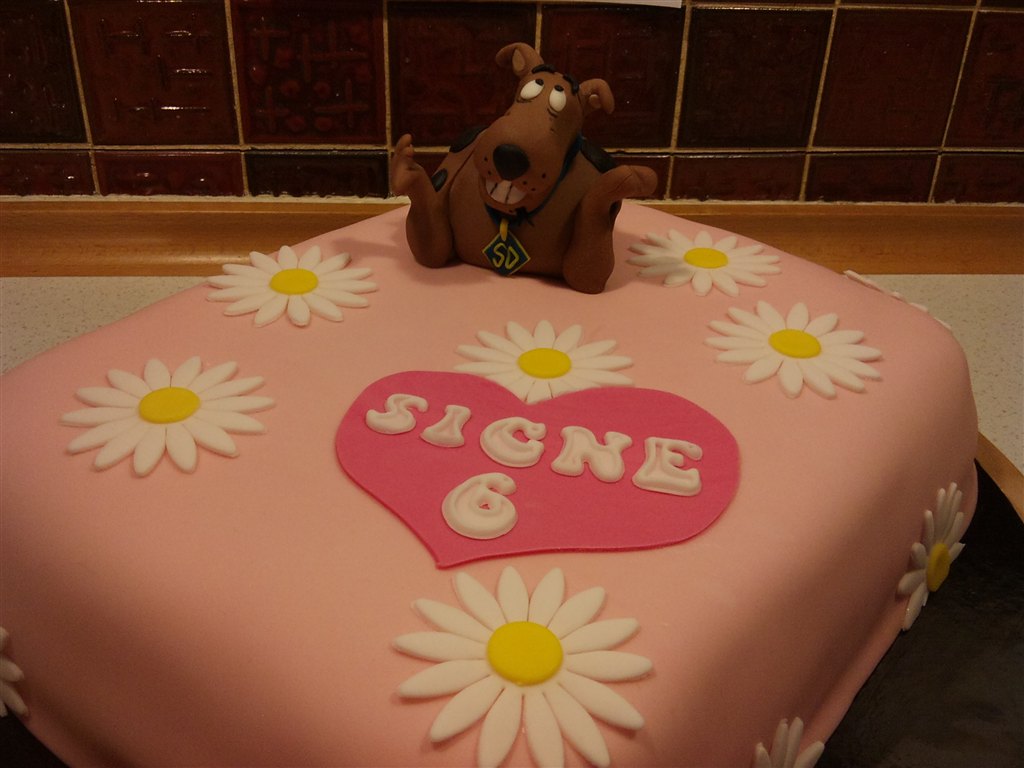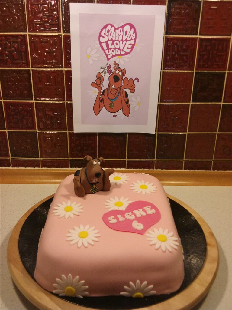 Jeg sætter et billede ind med Scooby Doo kagen og en kopi, som jeg skulle finde inspiration fra, synes det ramte godt