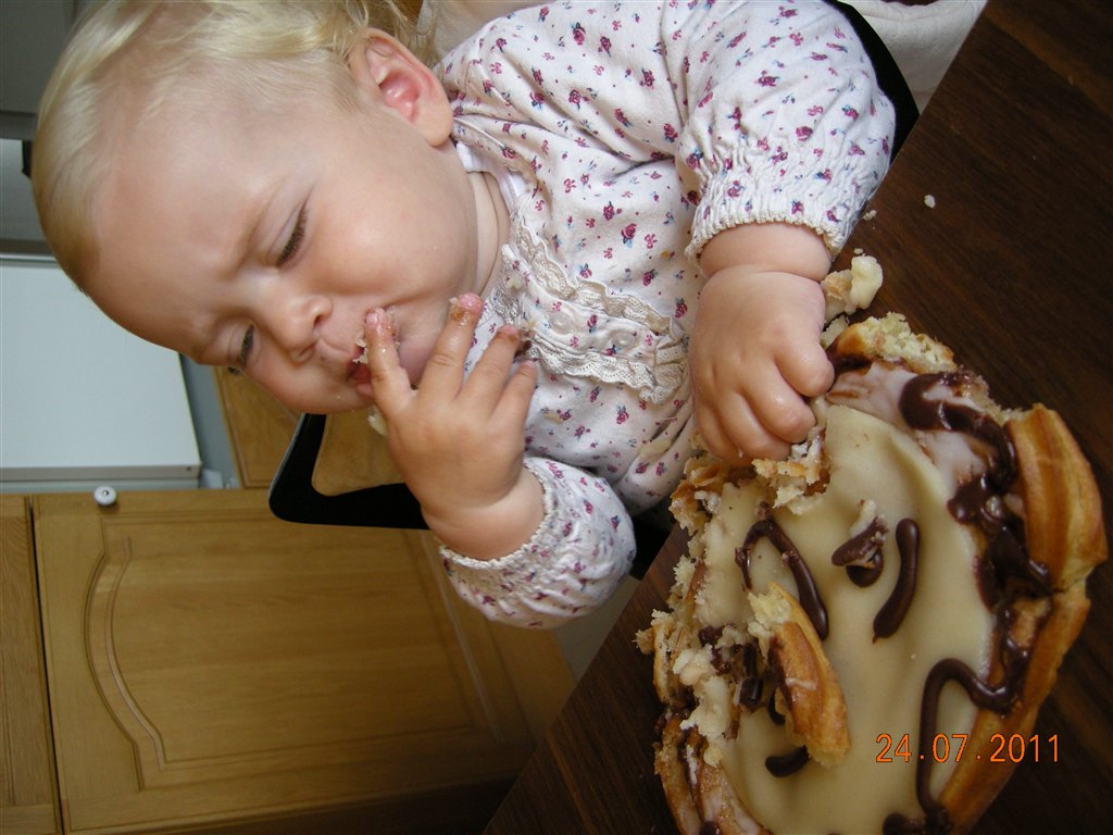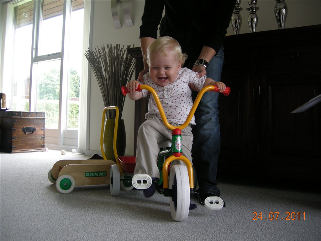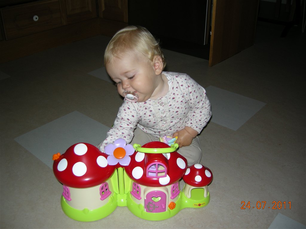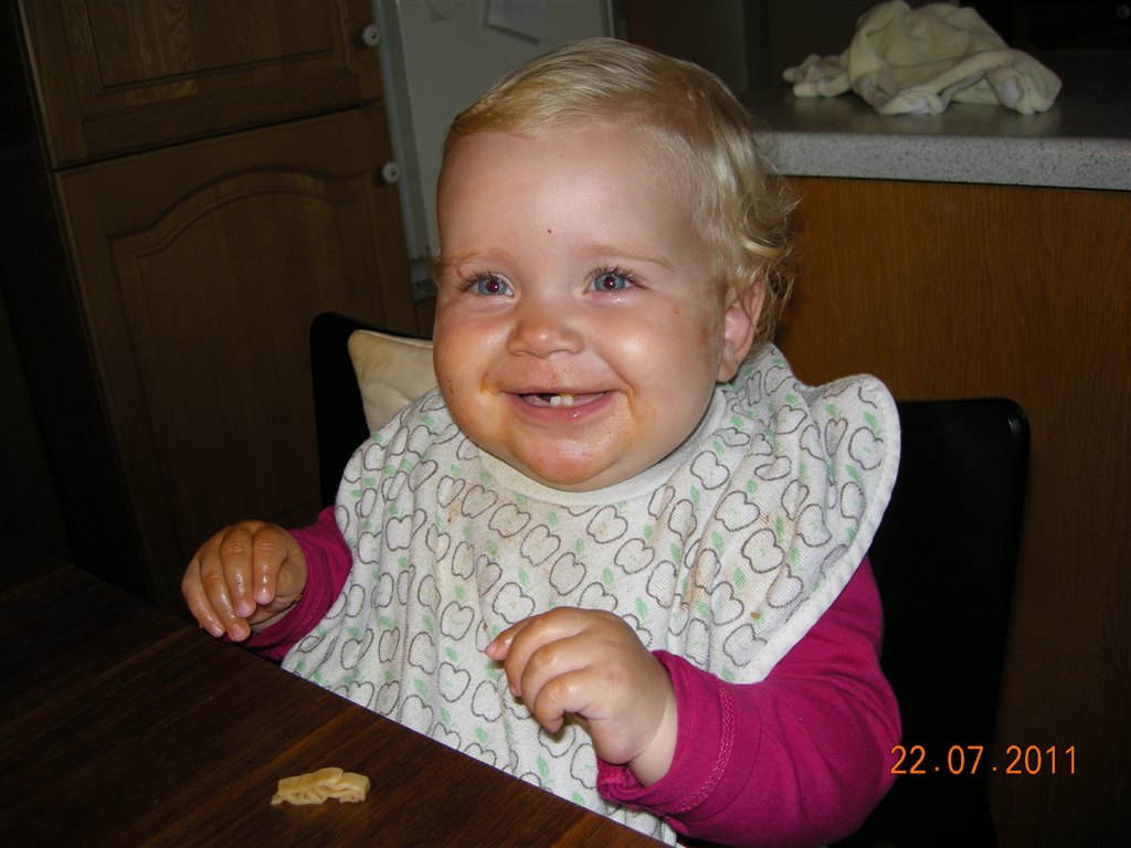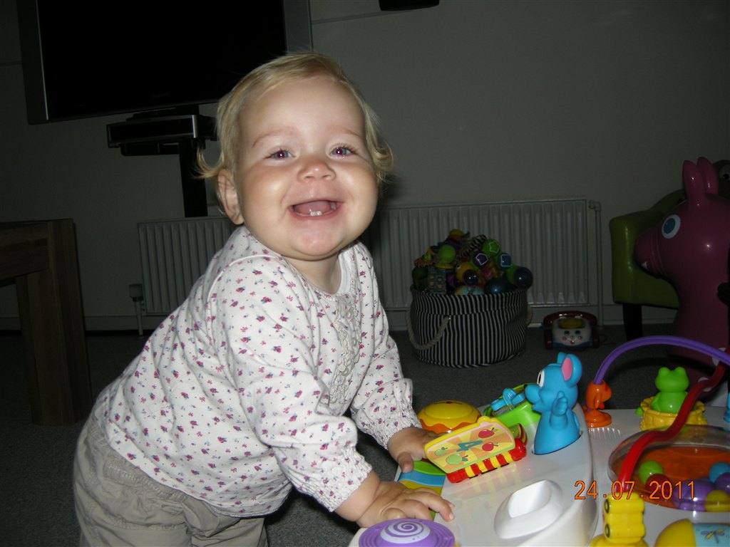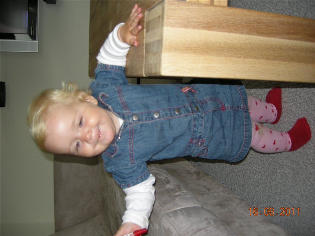Hun er blevet 13 mdr. nu og alt går som det skal. Det går fantastisk i DP, hun er en værre bandit deroppe. Hun har 6 tænder, og går nææææsten, hun kan gå 6-8 meter uden at falde. Hun vejer 11,5kg og er 76 cm lang. Hun vrøvler løs uafbrudt og det er altså ikke ret meget der gir mening hahahah, men pyt, hun hygger sig. Der kommer ord som: hov (når hun taber noget mere eller mindre med vilje) vov vov, ap ap (rap rap), op, hej hej (konstant råben efter alt og alle) og mange andre lyde. Hun elsker mennesker og opmærksomhed, vi kan plante hende i armene på folk hun aldrig har mødt og alligevel smiler hun over hele hovedet og råber HEJ.