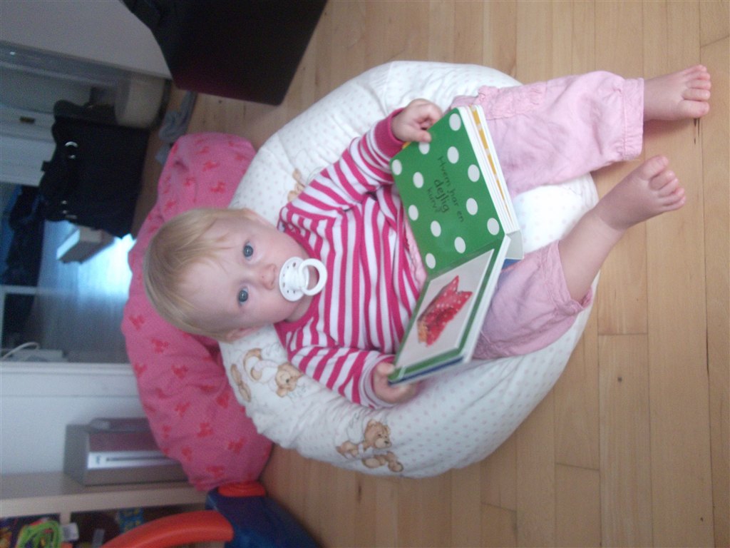 Er blevet glad for sækkestolen - hun finder den selv frem og putte hovedet ned i den
