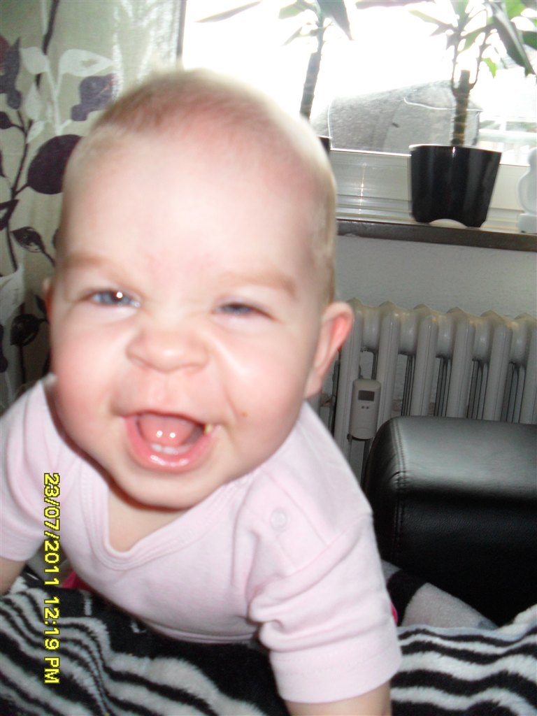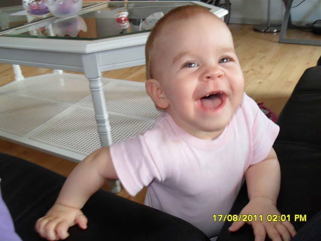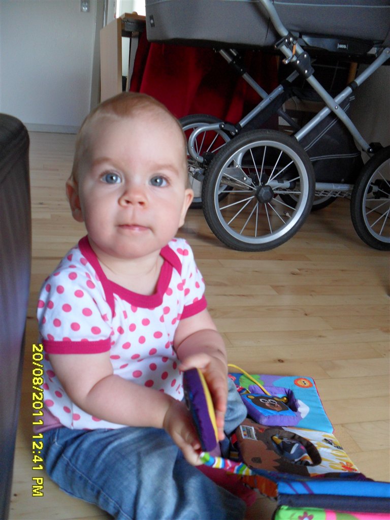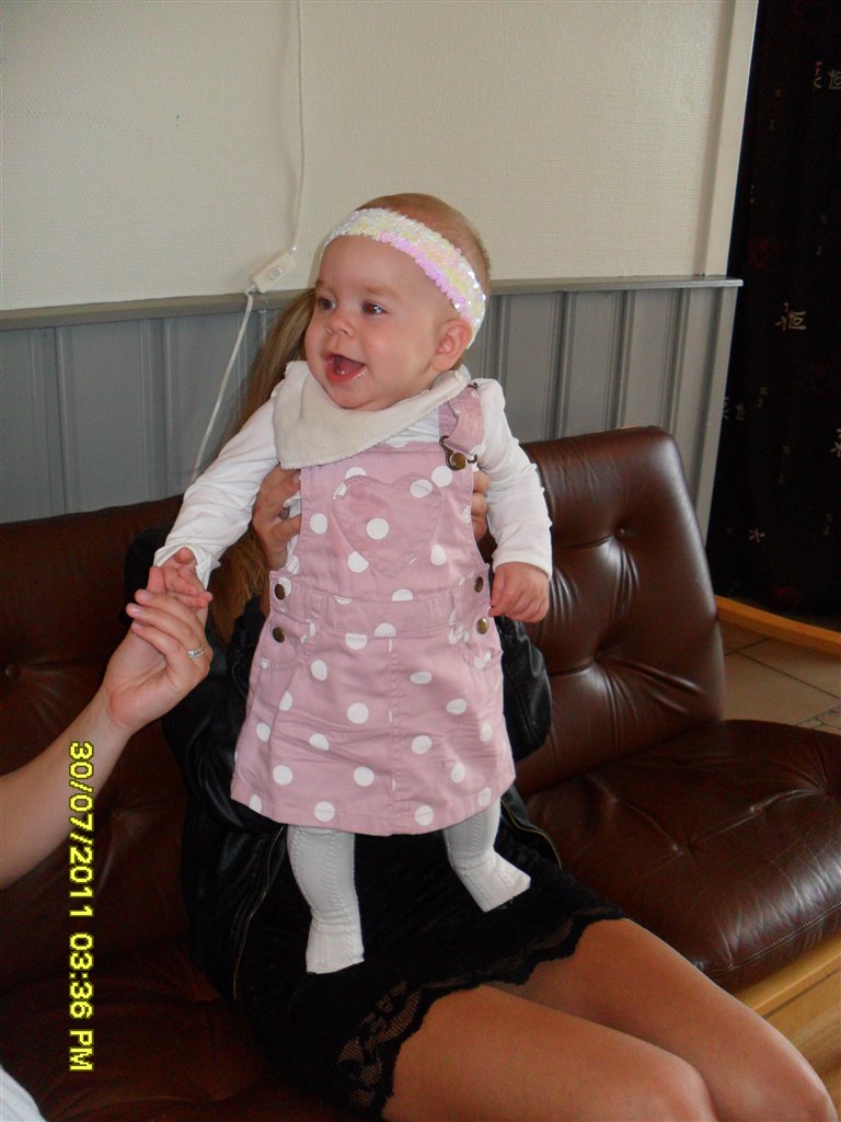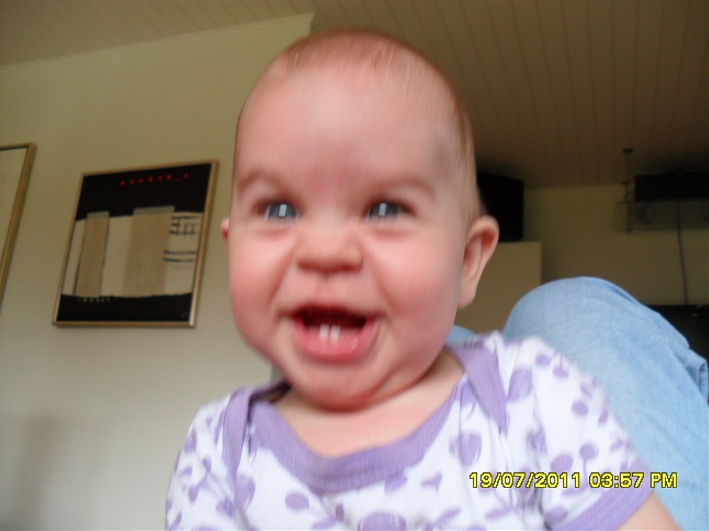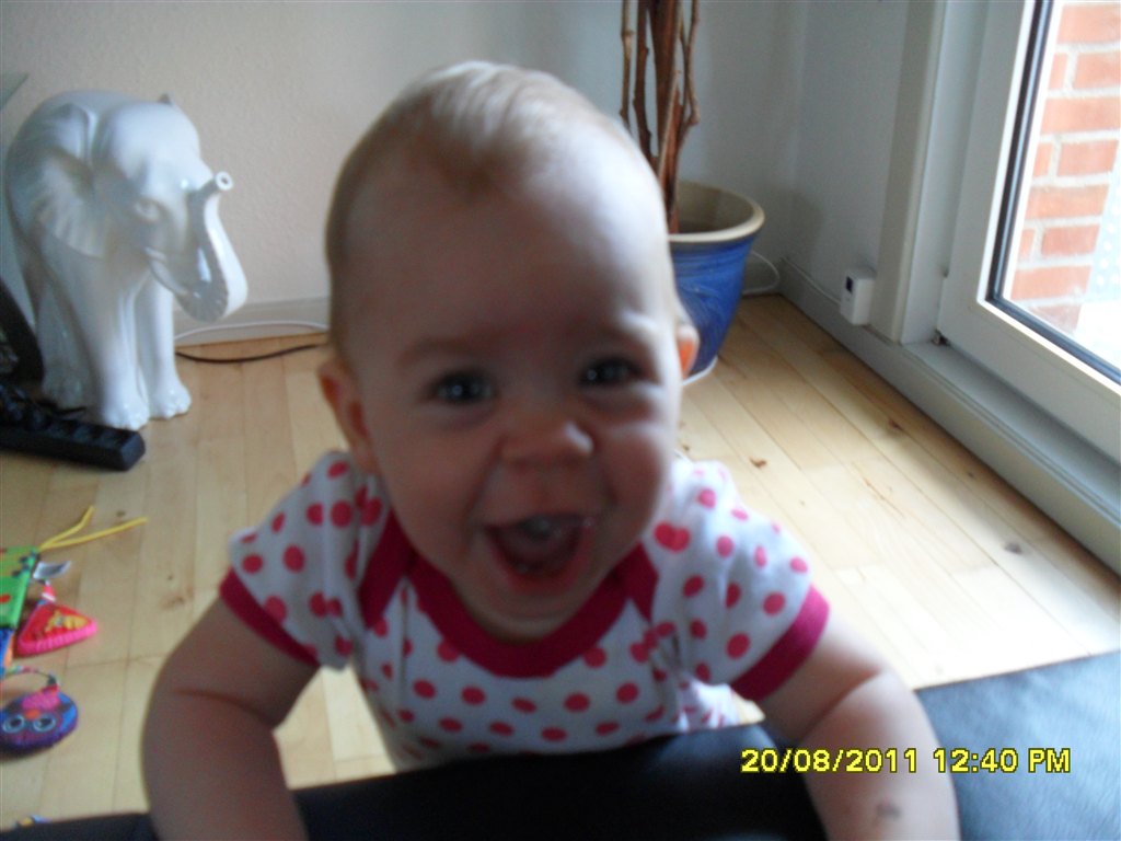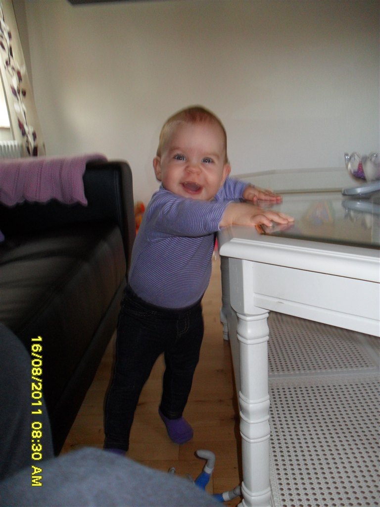 Hun er også lyn hurtig til det hele... Hun kan snart det hele... Går ved bordet, og giver ind i mellem slip... Kan selv kravle ned af sofaen, ja hun kan også klappe