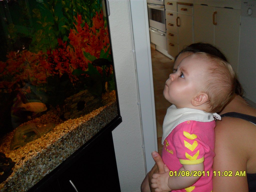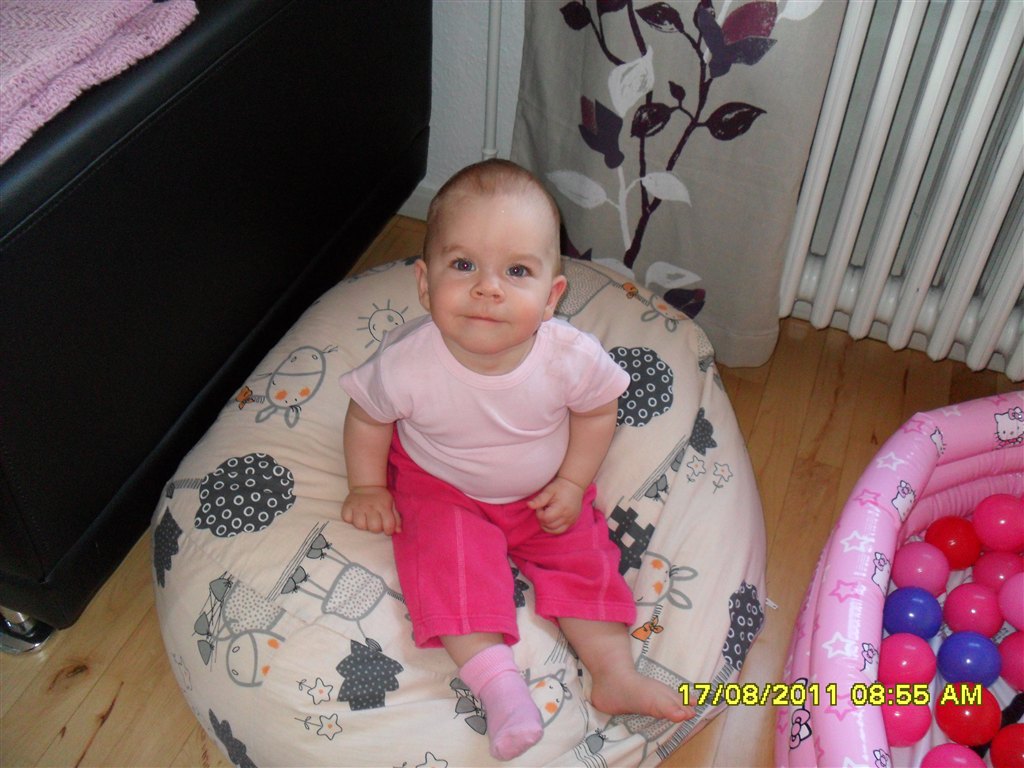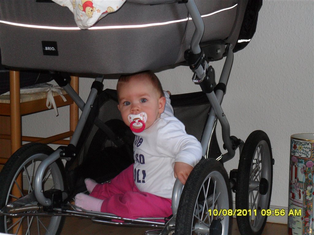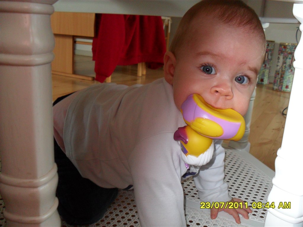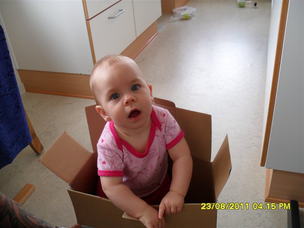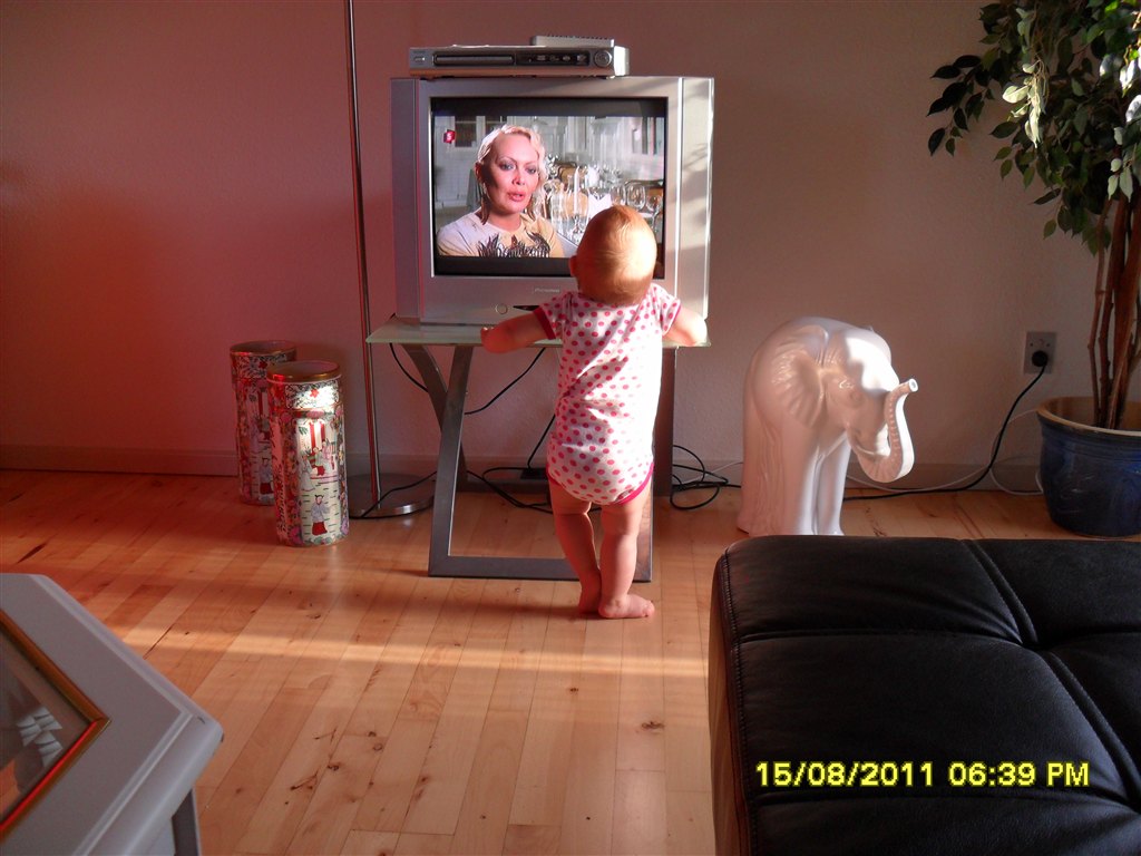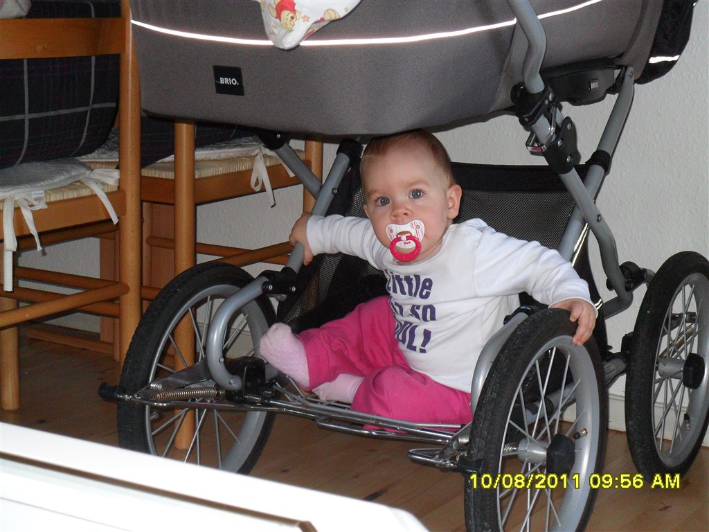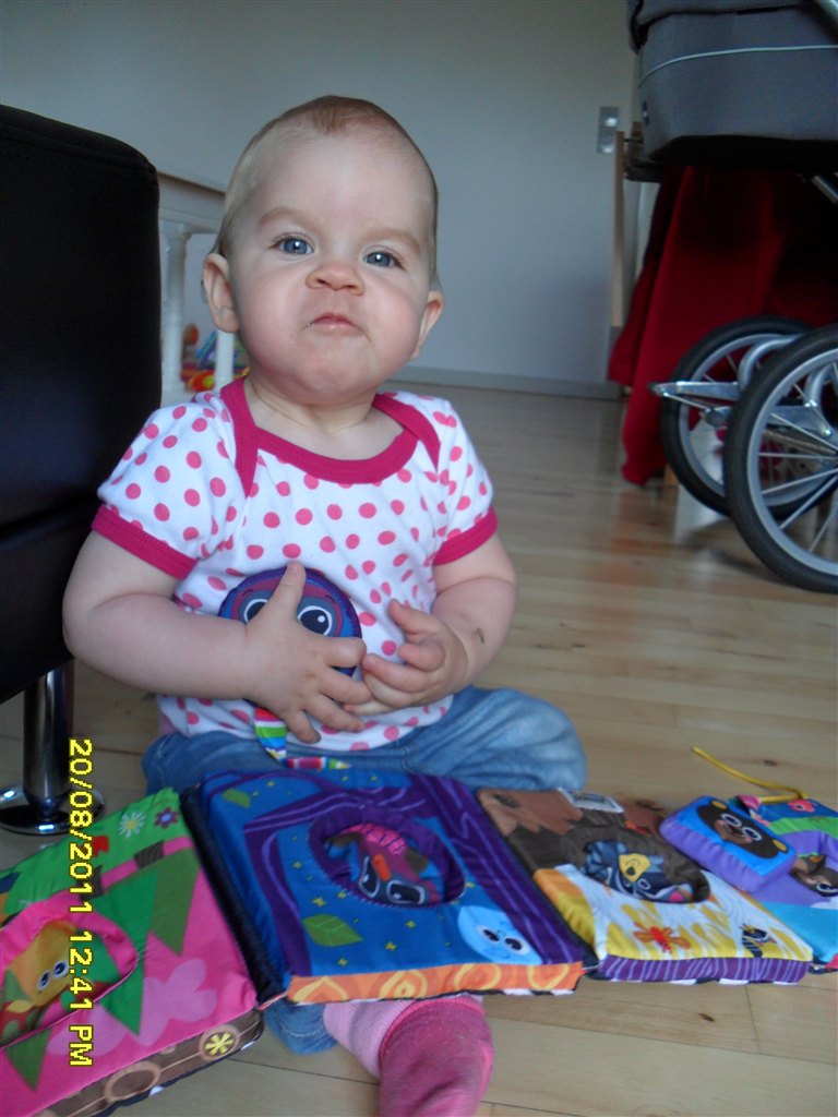 Hun er også lyn hurtig til det hele... Hun kan snart det hele... Går ved bordet, og giver ind i mellem slip... Kan selv kravle ned af sofaen, ja hun kan også klappe