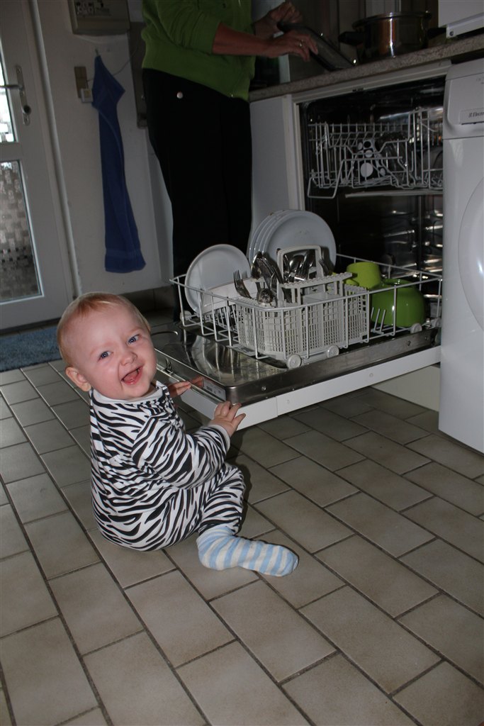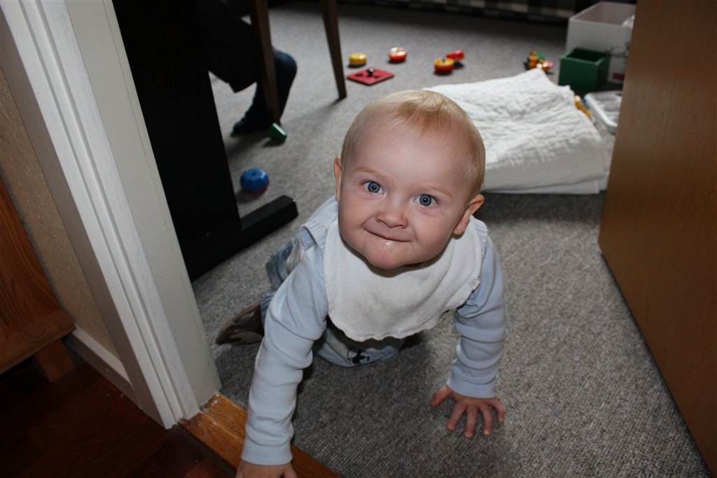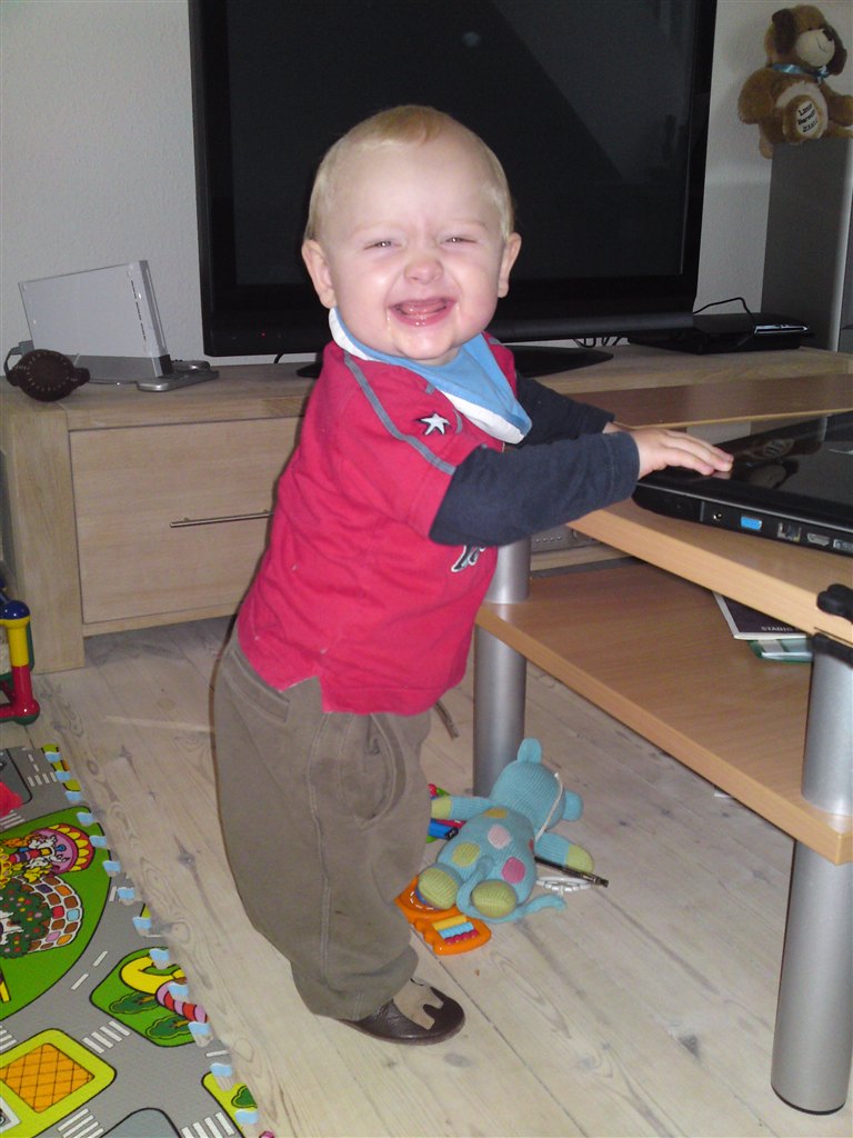 Han kravler på livet løs, rejser sig op ad alt (hvilket kan give lidt farlige situationer), går rundt om sofabordet og er dygtig til at gå med hjælp fra en, som holder ham i hænderne.