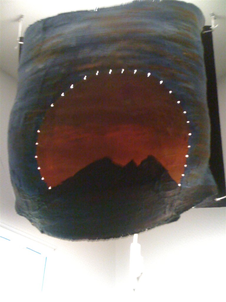 Den anden lampe er af min mave, mens Elias lå i den - formoder omkring 4 mrd, men hæng mig ikke op på det. Husker det ikke klart. Gemalen har farvelagt og malet den. De tre bjerge symbolisere os, mor, far og vores kat - solen symboliserer Elias