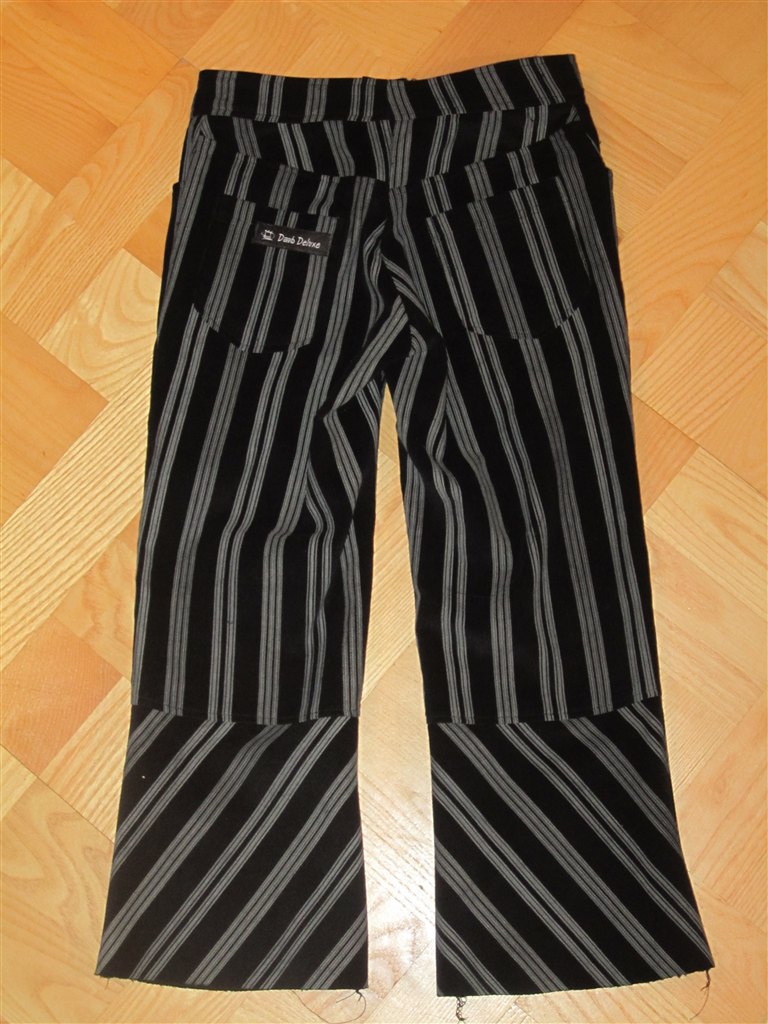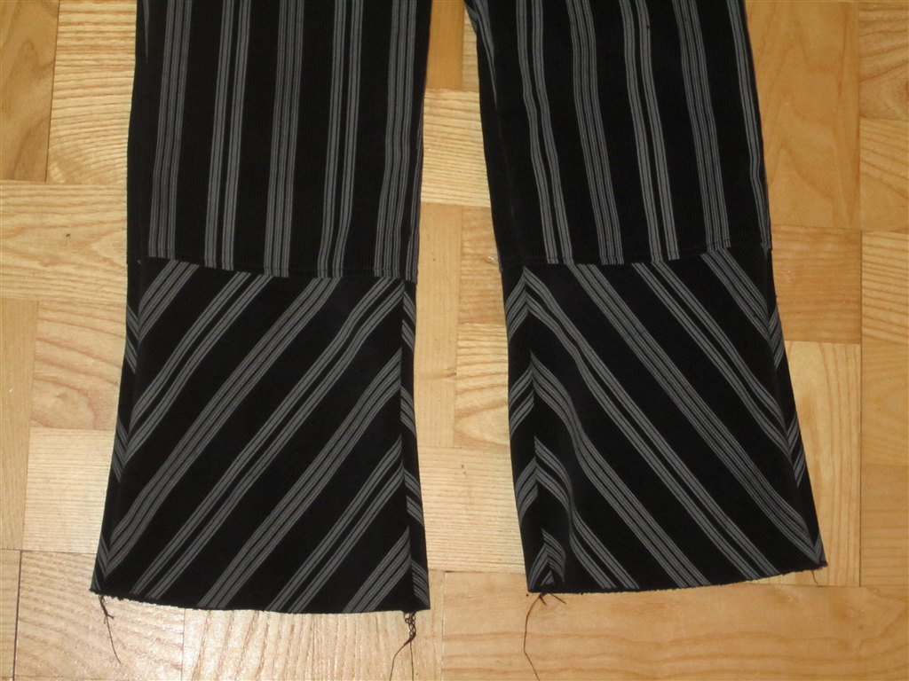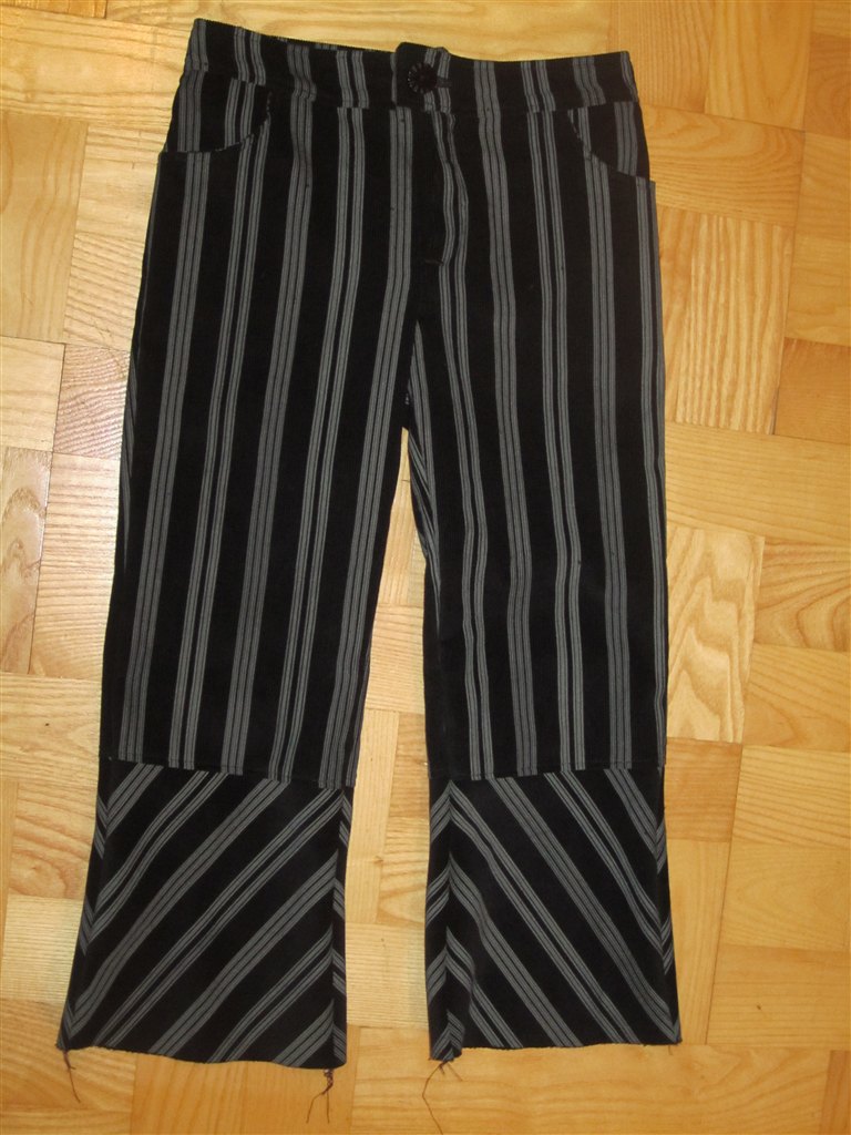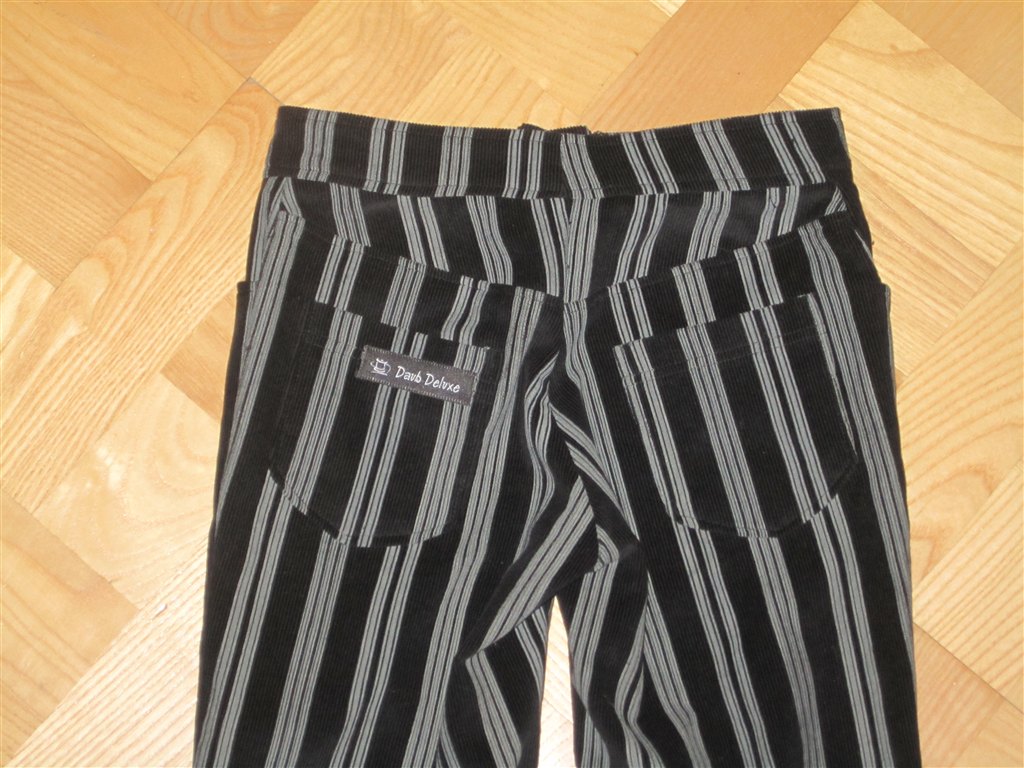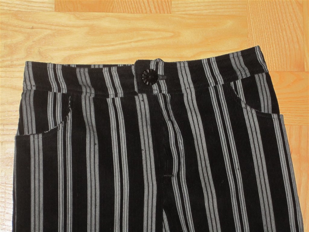 Stoffet er babyfløjl med lidt stræk (21 wales - købt hjem fra Korea) i sort med grå striber. Modellen har lynlås og knap, indvendige lommer foran og baglommer og en fed detalje ved benene. Derudover er der lidt svaj i benene, så det er en rigtig tøsemodel. De er ikke lagt op endnu - jeg skal lige have hende i dem så jeg kan få længden rigtig.