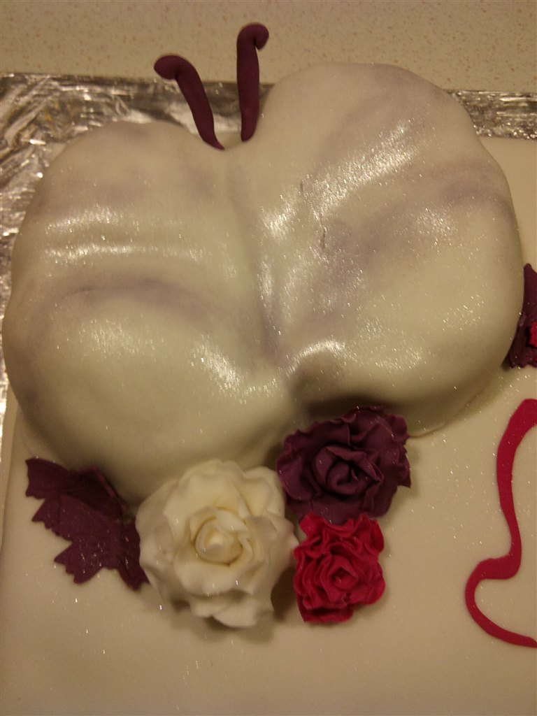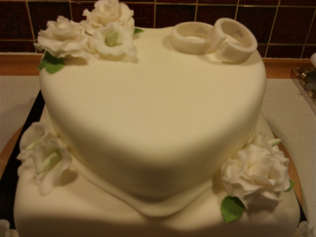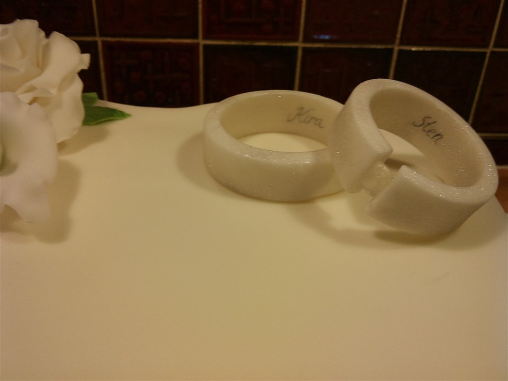 Så en bryllupskage, hvid med blomster og ringe, den ene med "diamant" lavet af Isomalt, chokoladekage med hvide og mørke chokostykker i og hvid tobleronecreme.