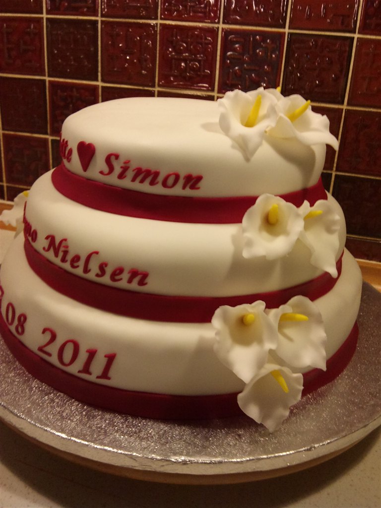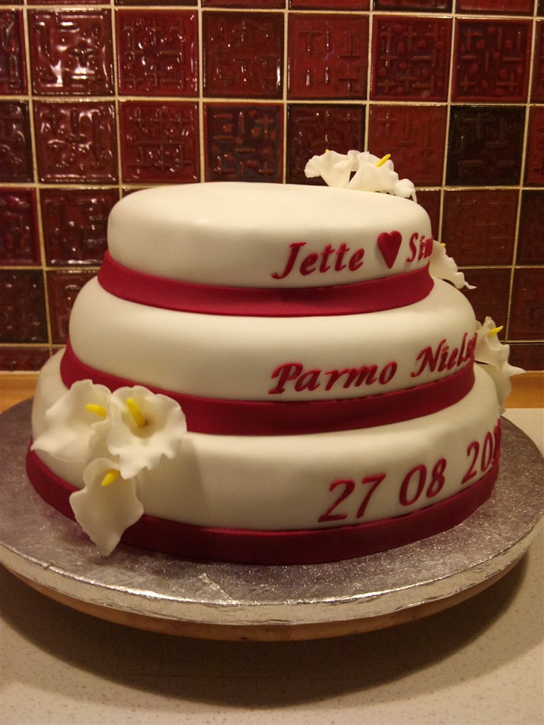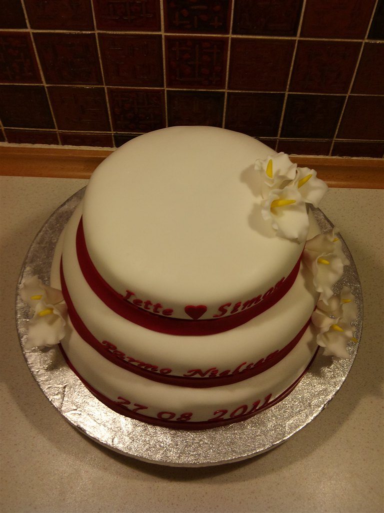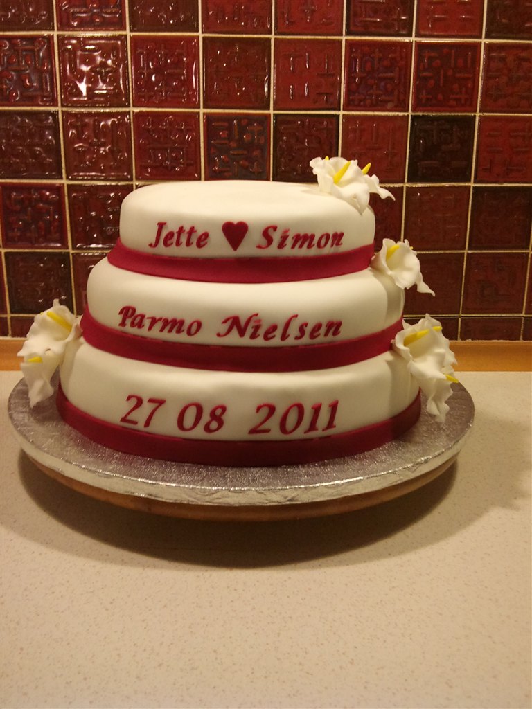 Tilsidst en bryllupskage, der skulle være hvid med blodrøde bånd og bogstaver, bananlagkagebunde med en lækker nougatcreme smurt op med chokoladesmørcreme.