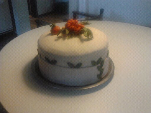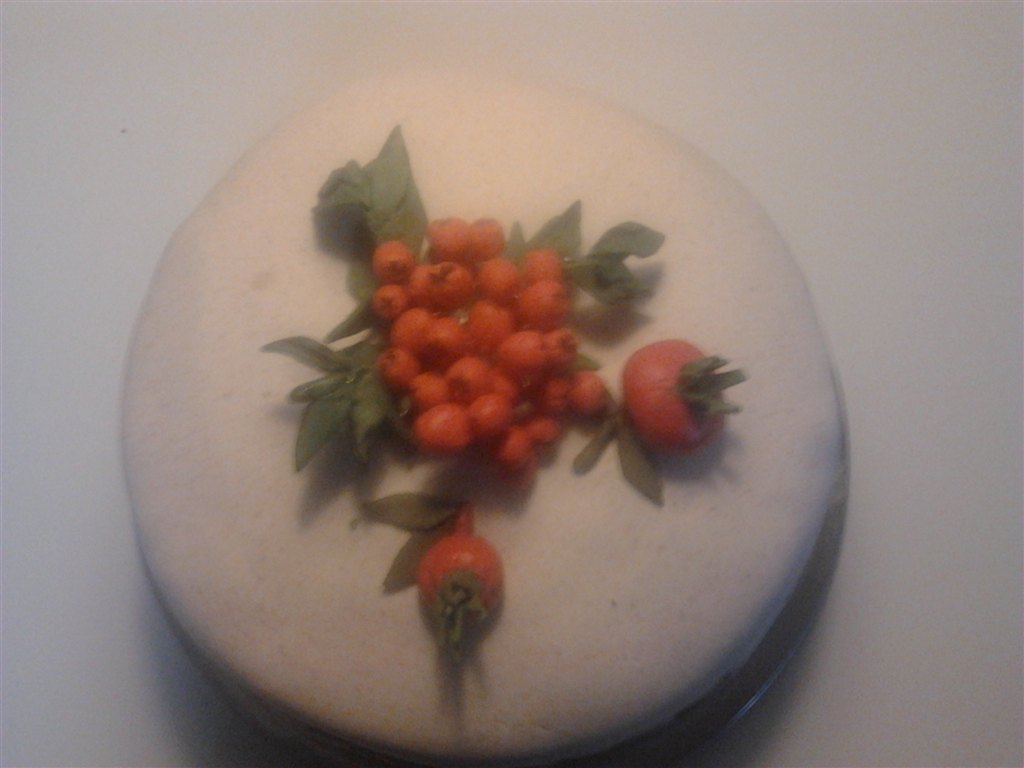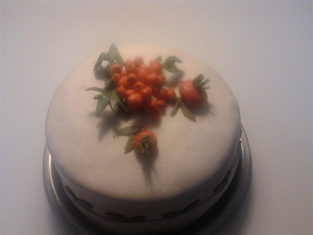 Jeg havde lavet den i to lag, så der var et lag pap i midten, og skar den så i to etager så at sige. Det fungerer fint. Pynten er lavet i hånden, tematet for festen var sensommer, og der var pyntet op med rønnebær, kastanjer, hyben og modent korn, så det skulle selvfølgeligt gå igen i kagen. Rønnebærene er monteret på sølvtråd, og DAMN, det gør jeg ikke igen lige foreløbig...