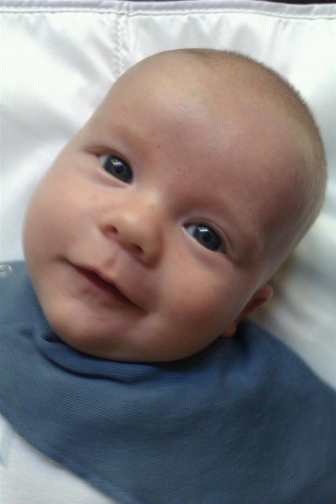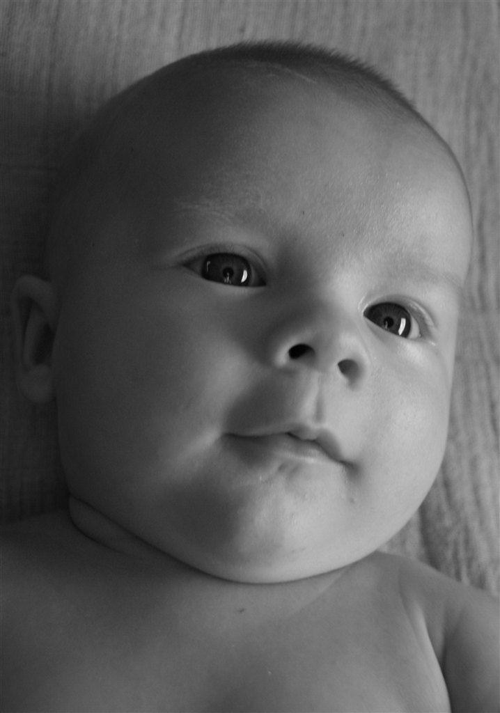 Et sort/hvid billede af den lille gut, taget igår aftes. Og et i farver fra søndag, hvor han var præcis 2. mdr. gammel!