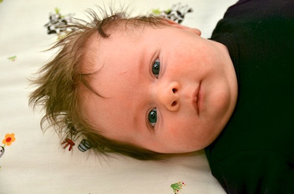 Han blev født med en masse mørkt hår, men nu vokser det ud med lyse hår i rødderne, så han blir' nok en lys lille gutt, med tiden. Havde han været en pige, kunne jeg samle det i en elastik (har allerede prøvet, hi hi, men sig det ikke til hans far).