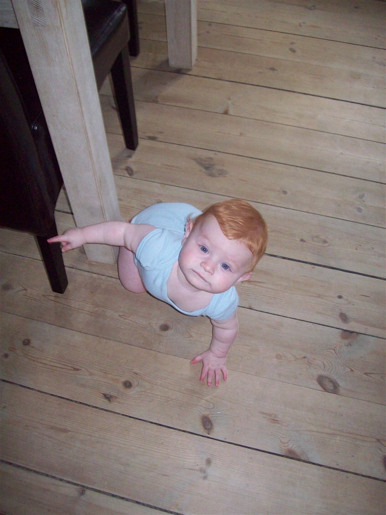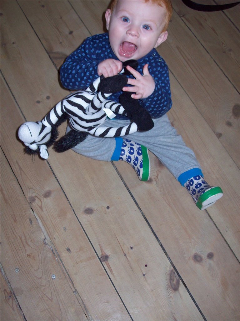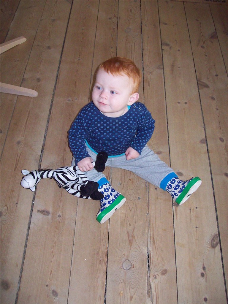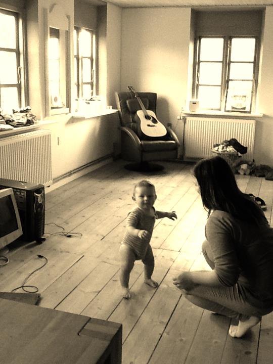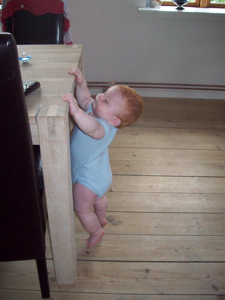 Han har taget sine første skridt , dog går han ikke endnu .. Han står tit op og griner når han gør det .. Det er bare sjovt