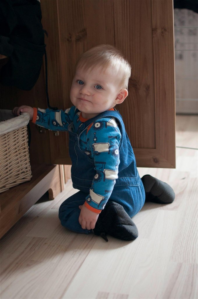 Han kravler rundt over det hele, han rejser sig op af alt.. hans yndlingslegetøj er alt andet end sit eget legetøj. hundens mad og vandskål.. så vi skal i IKEA og købe et gitter ud til køkkenet så han ikke kravler derud. for han er hurtig. og fræk...
