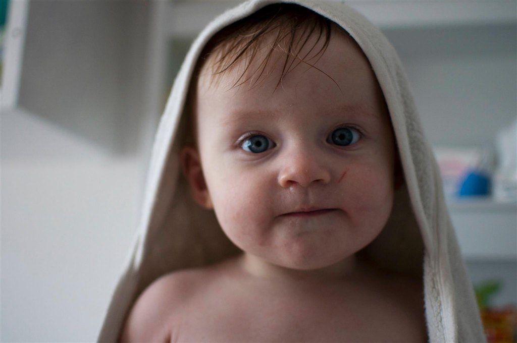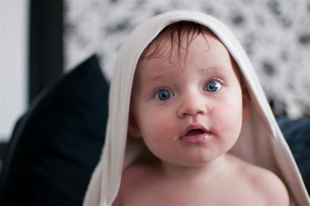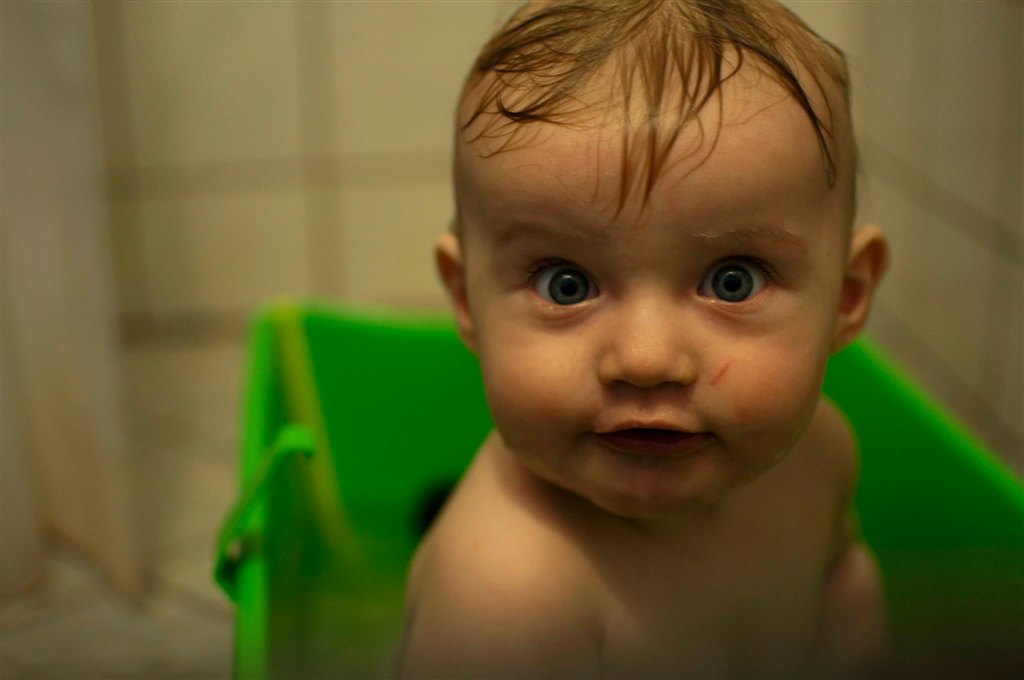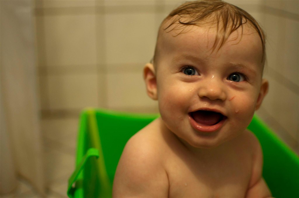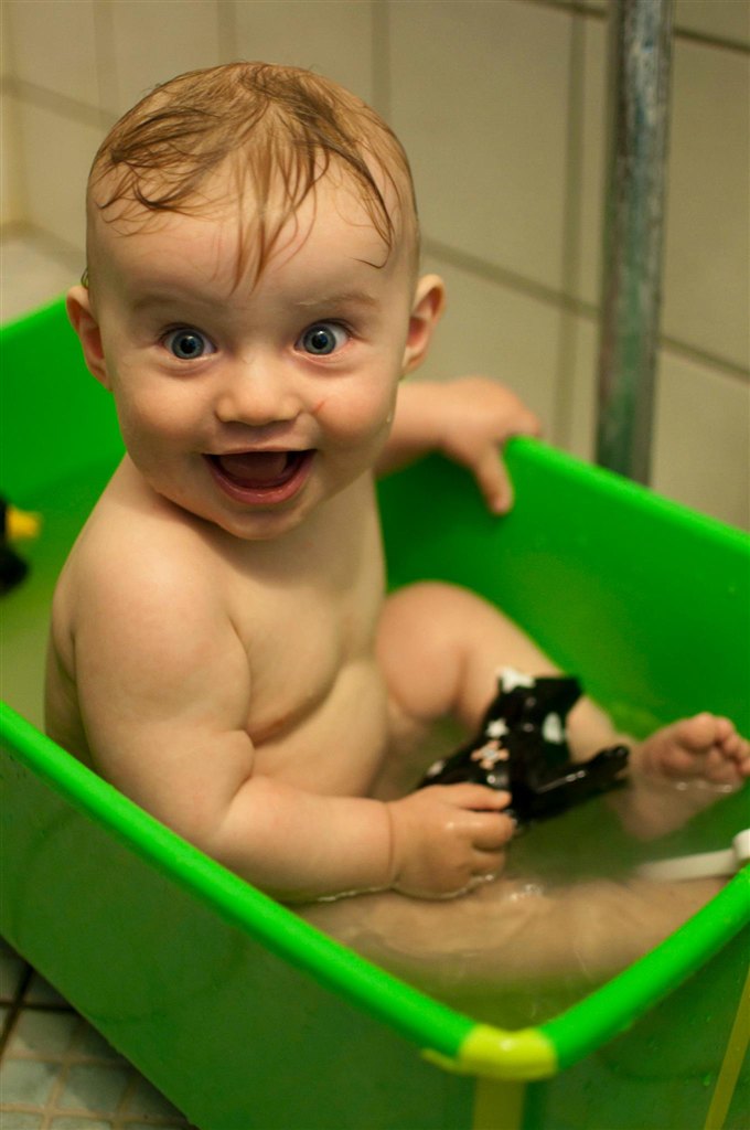 han har næsten lige lært at sidde i badet. førhen havde han det med at falde bagover når han legede med et stykke legetøj, nu har han lært at holde balancen.. men fanden om så ikke knægten nu hellere vil op og stå i badekaret i stedet for..