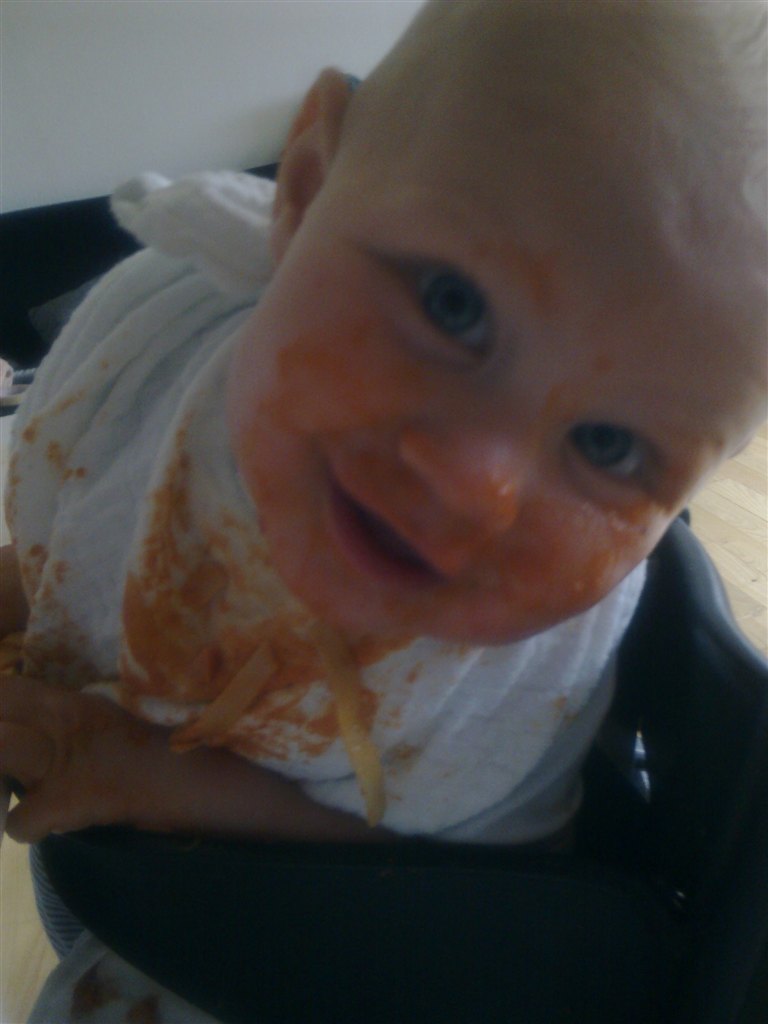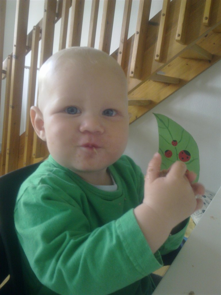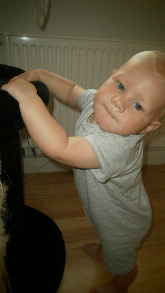 Tænk at han kan rejse sig op af ting, og nu tage få skridt imens han holder i noget! Og kravler rundt, og spiser sååååå flot selv