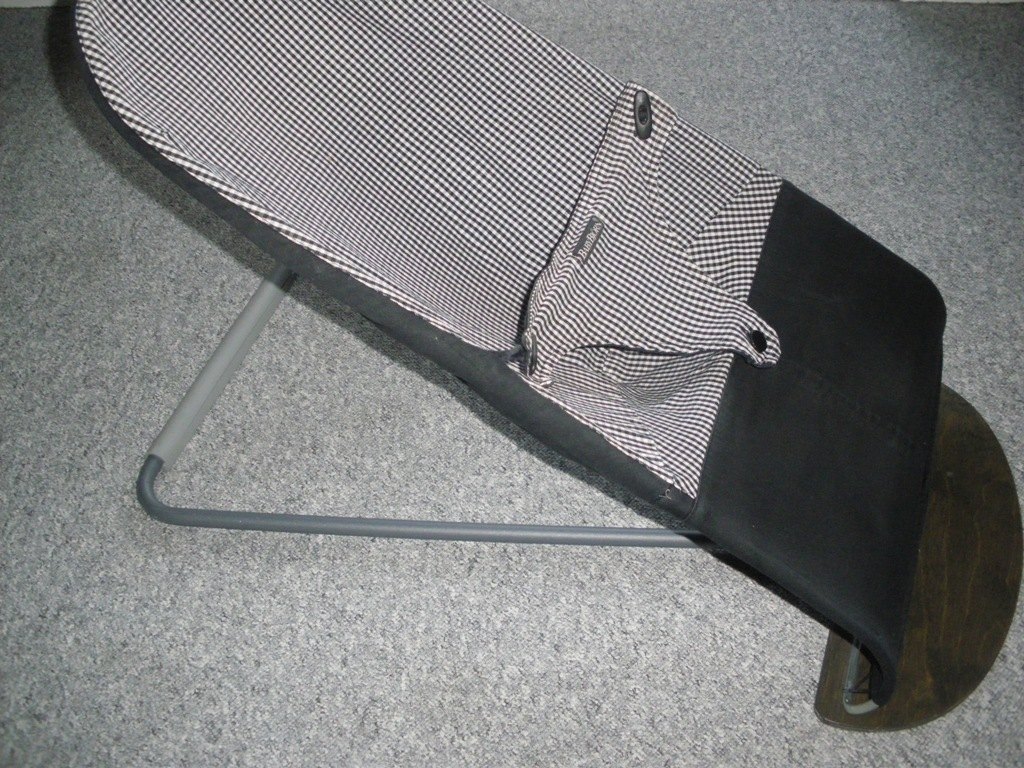 Babybjörn skråstol, som kan sættes i 3 forskellige højder og næsten lægges helt ned. Stoffet er sort på den ene side og ternet på den anden - det er vendbart. Den er brugt, men stadig fin. Nypris 999 kr. - 375 kr.