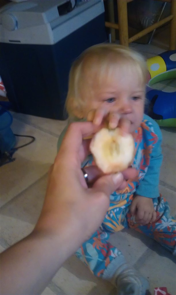 lækker lækker, og meget imponeret, anton er 18 mdr og har 12 tænder, men Han gas lidt svært ude at finde ud af at man skal tygge maden med dem. Han gnasker lige sådan en æblebåd i tusind stykker ind i munden med fortænderne og så er munden fyldt og så kan han ikke finde ud cd mere andet end at Han gang på gang er ude at blive kvalt, så her ds det desværre nogo