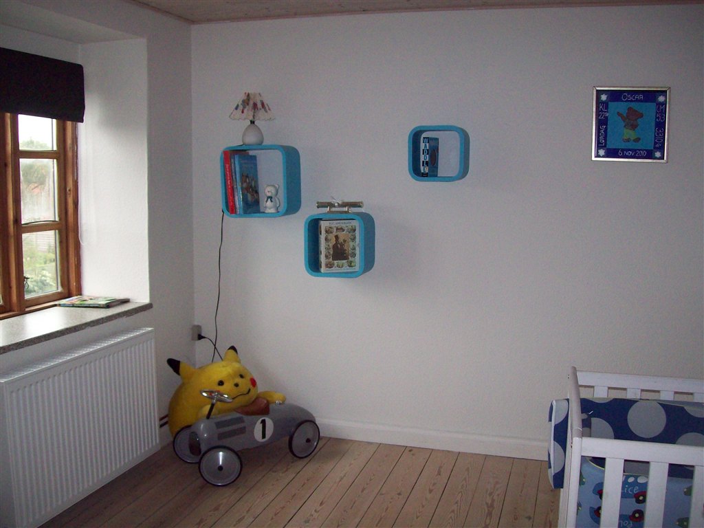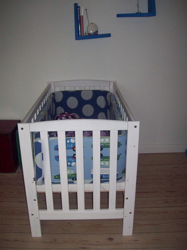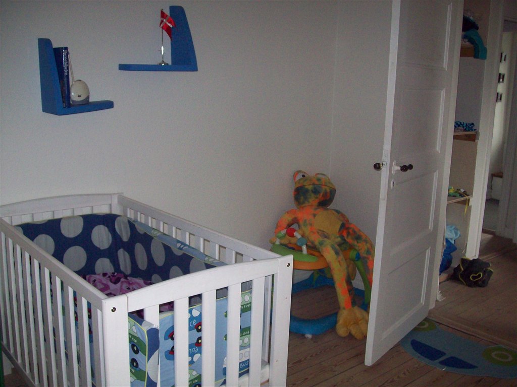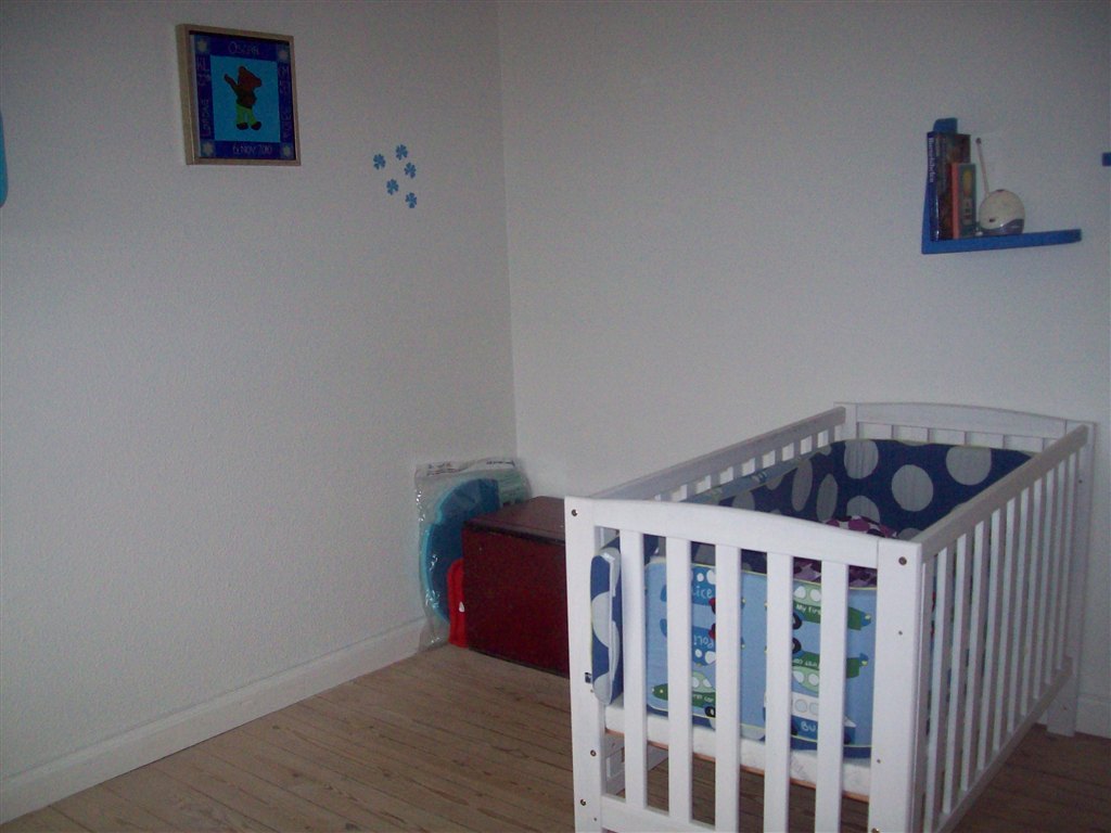 Børneværelset bliver nok mest et pusle/legetøjsopbevaringsrum i starten, men der kommer også en tremmeseng derind, til når han/hun bliver ca. 6 måneder. I soveværelset har vi en vugge, der går i arv i min kærestes familie.