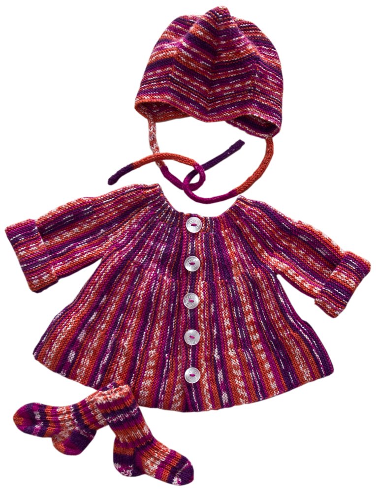 Ej, jeg er bare helt vild... Min mor strikkede og syede meget til mig, da jeg var lille, men har holdt pause i virkelig virkelig mange år. Nu hun skal være mormor, er der bare kommet omdrejninger i maskineriet, og hun syer og strikker i ét væk! Og synes det er SÅ flot! Hun får min stedfar til at tage billeder bagefter, og så skærer hun det ud i photoshop, så det rigtig kan vises frem. Synes bare det er så mange fine ting hun har lavet! Lige nu er hun ved at sy to sparkedragter