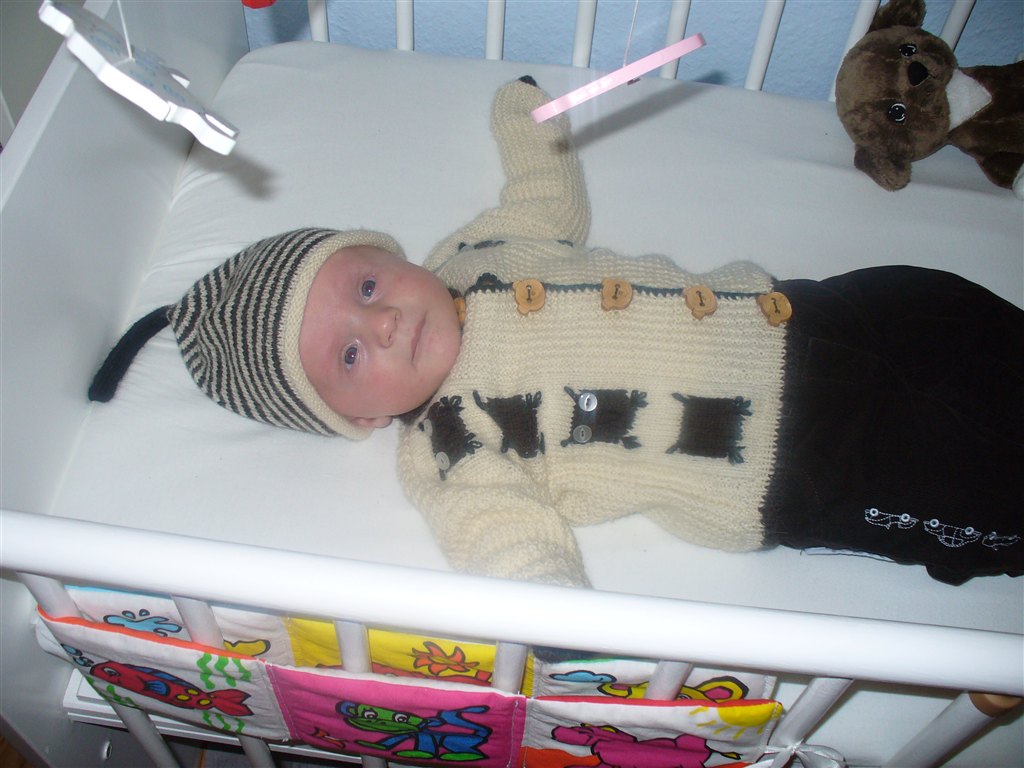Her er lige et billede af Daniel i hans trøje, han var ca. 3 mdr., så det er jo et par dage siden (han bliver 2 år lige om lidt)