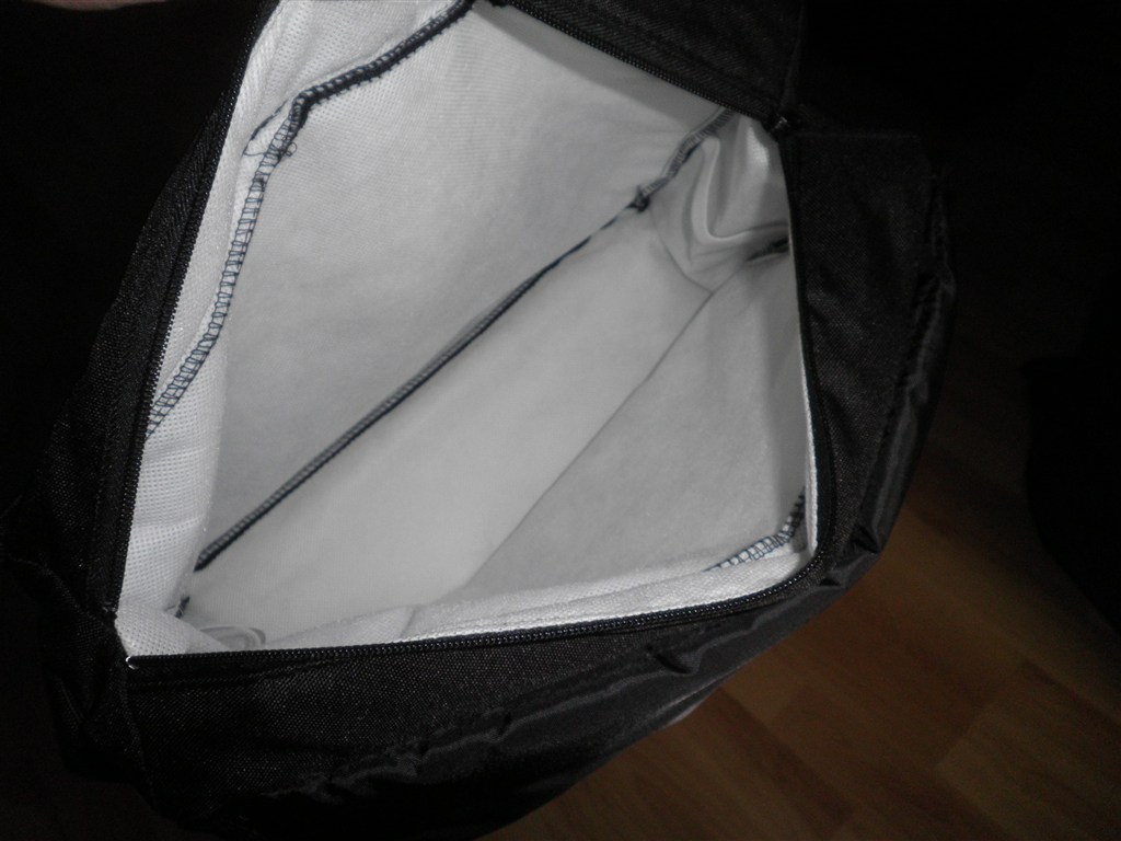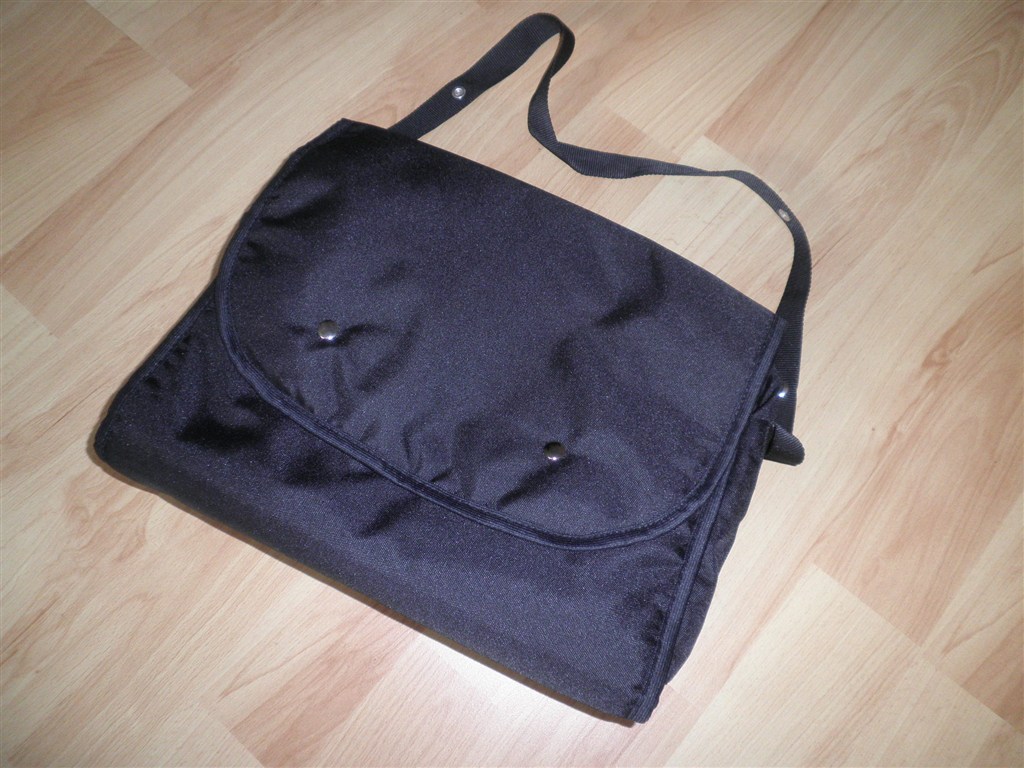Sort med et stort rum. liggeunderlag sidder udenom tasken..