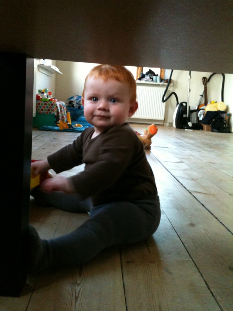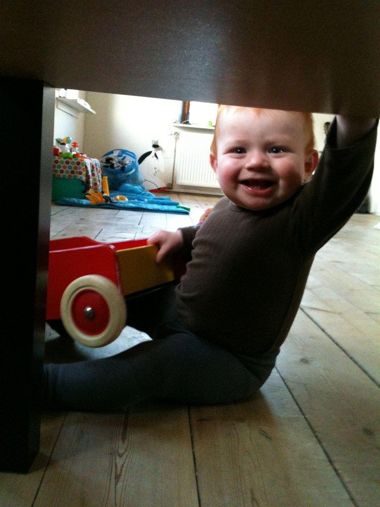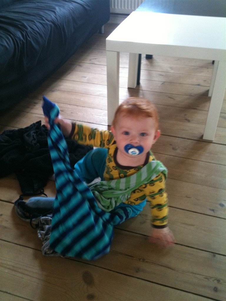 Han er en lille bandit , der står selv stadigvæk .. Han kan godt gå et par skridt hvis han gider , men det går meget hurtigere og kravler