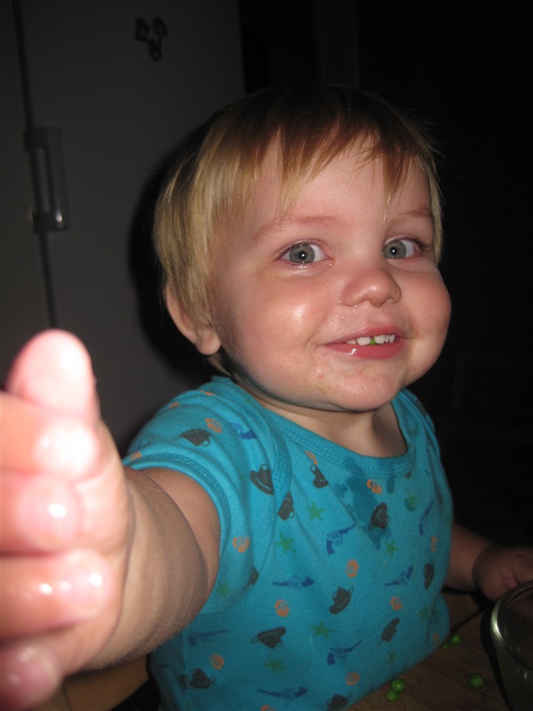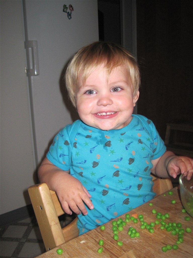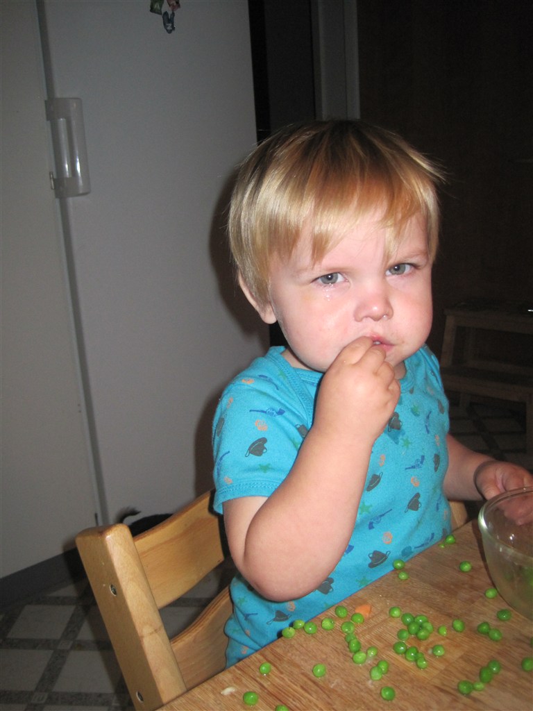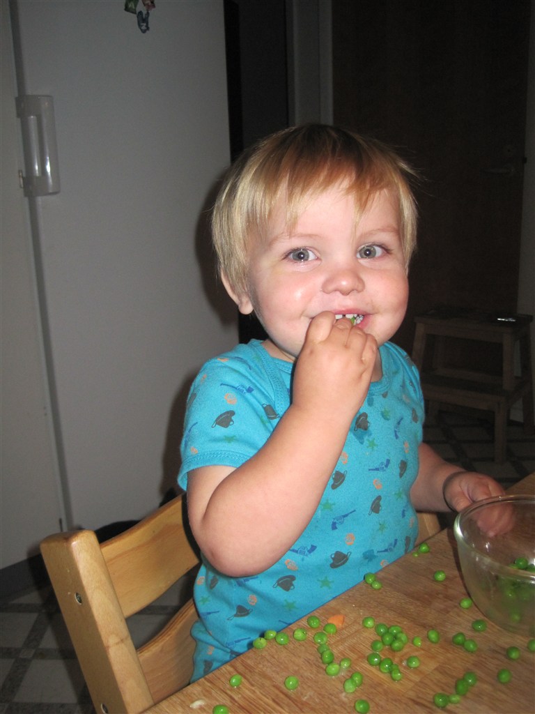 Selvom man er syg og har 40.3 i feber kan man stadig charme mor.... Det eneste drengen vi spise er ærter, så han får da ærter. På de billeder hvor han ser sur ud har han lige fået nej til at han må smide dem på gulvet til hunden.... Ja ja, så gal man kan se ud!!