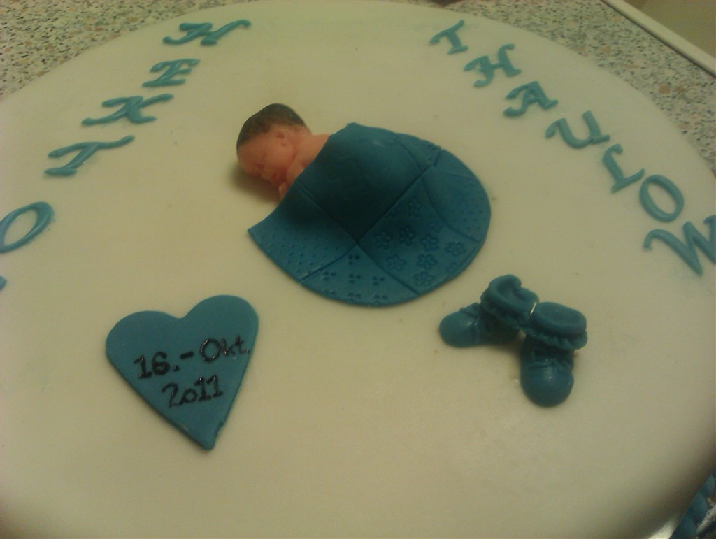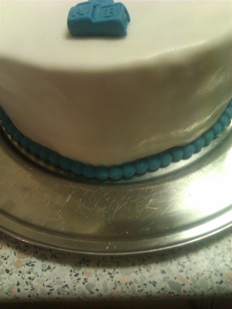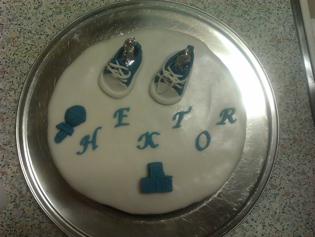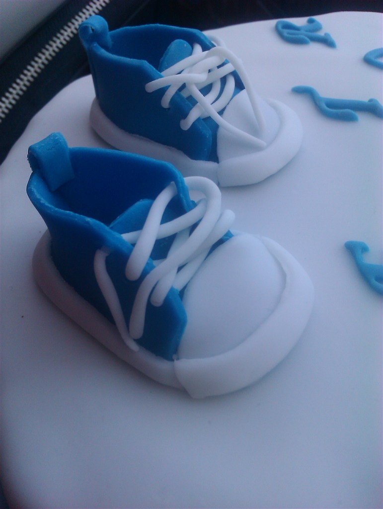 TykkeTrunteMor skriver: Så fk jeg også "lov" til og lave en dåbskage Min "søster" - min fars' kæreste's datter - skulle ha' døbt deres dreng, og jeg blev spurgt om jeg ville... Og self ville jeg det MEN!!!! Alt der kunne gå galt, det GIK galt... Kagen der ikke ville bages ordenligt Moussen som ikke ville stivne Converse-sko'ne som måtte laves om baby'en der lignede en alien Kagen der ikke ville være rund og blev skæv Fondaten som krakkelerede og fik fra hinanden Stavepladen som jeg glemte (Stavede navnet forkert) Ja jeg gik i panik, og var igang til 20 min inden vi skulle køre! Men jeg er alligevel PAVE-STOLT af kagerne For de fleste var vilde med kagen Der var 26 pers. den store er 25 cm X 7cm og den lille er 20 cm X 12 cm (Ca.) Og der var knad 2/3 af den lille og 1/6 af den store Mange hilsner TTM (Som for alvor er bidt af en stor kage nu)
