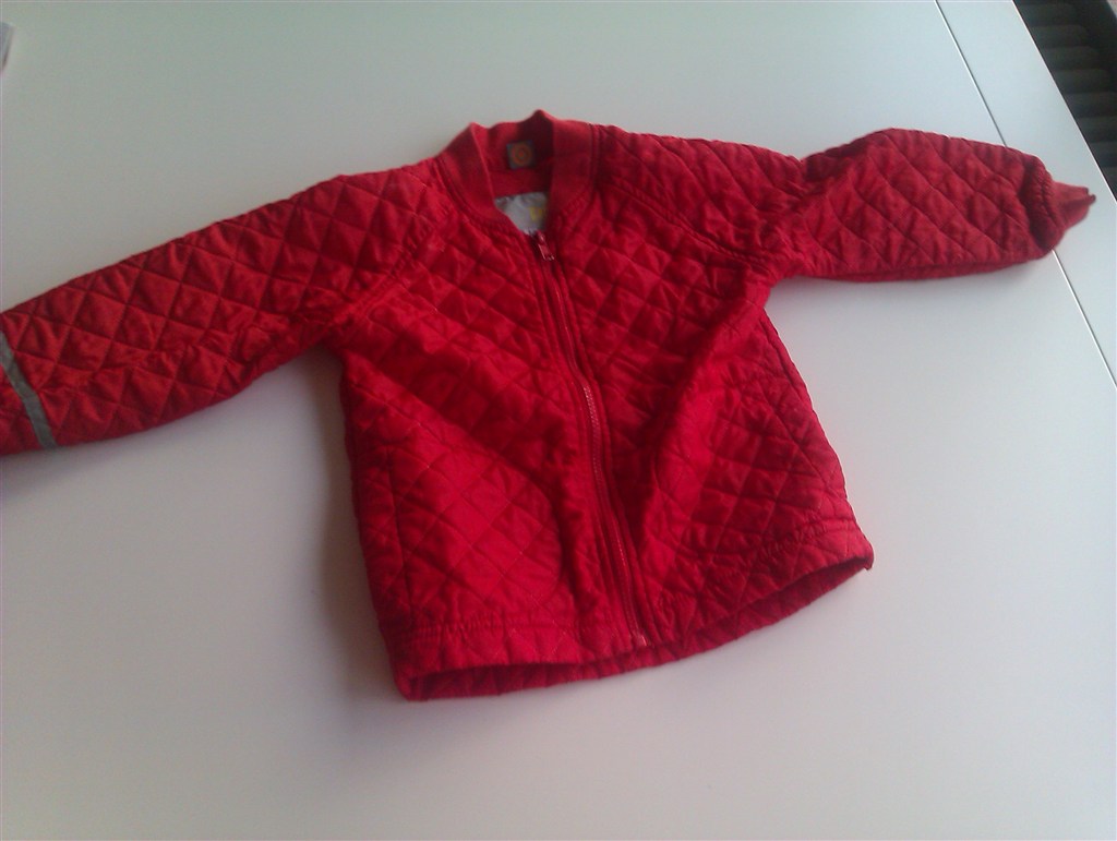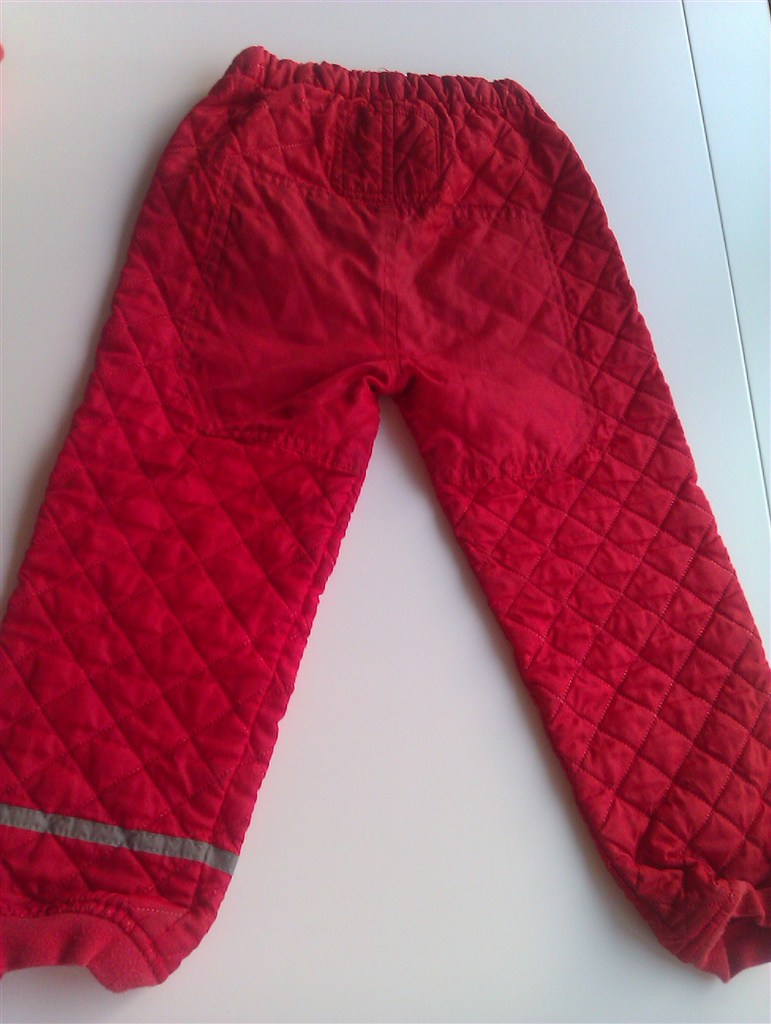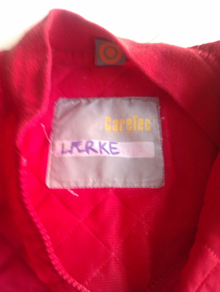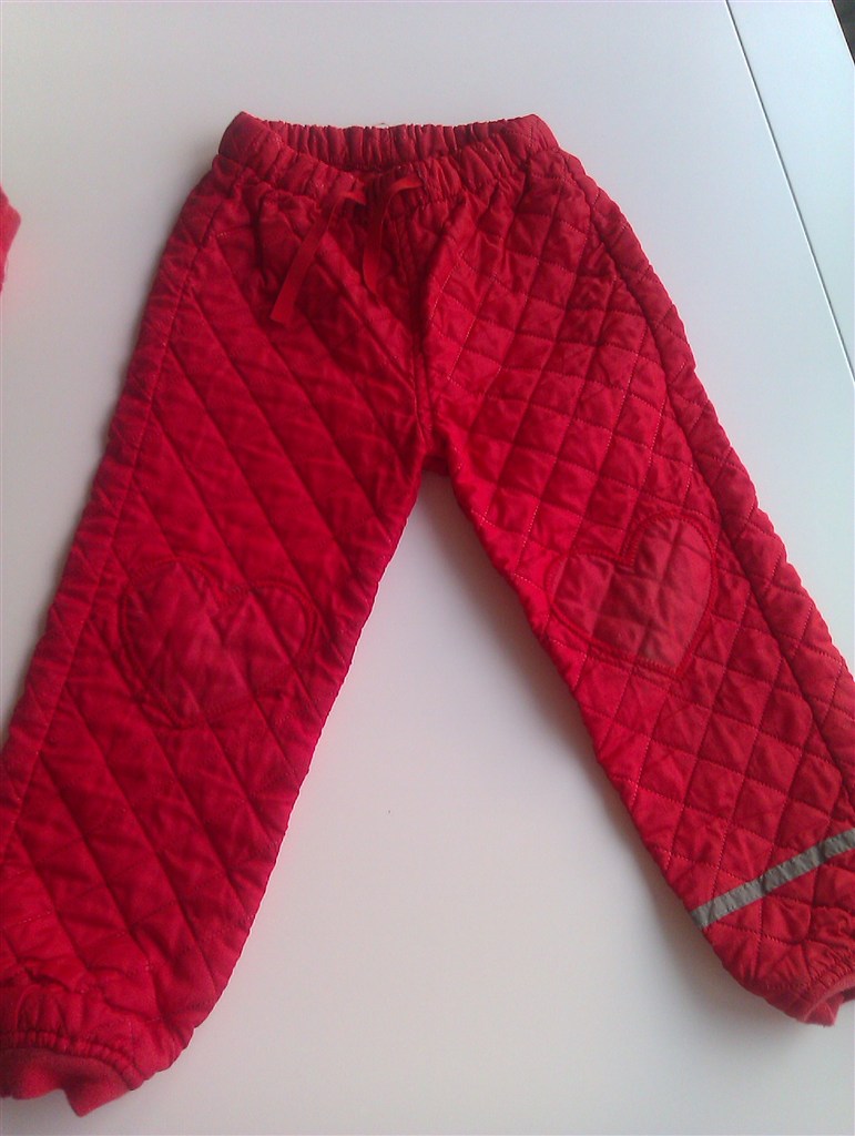 lærkes_mor skriver: Her er der billeder. (det er dog ikke vasket..)Der står min datters navn i både bukser og jakke.Der er hjerter på knæ og albuer.Ingen hulller.
