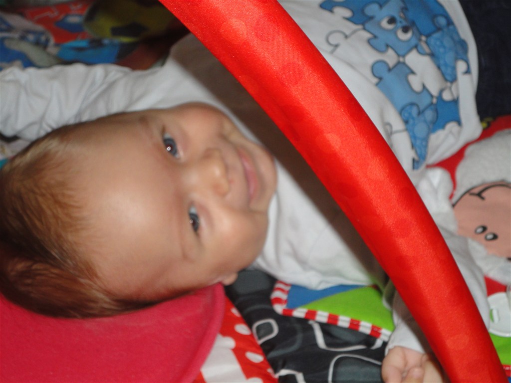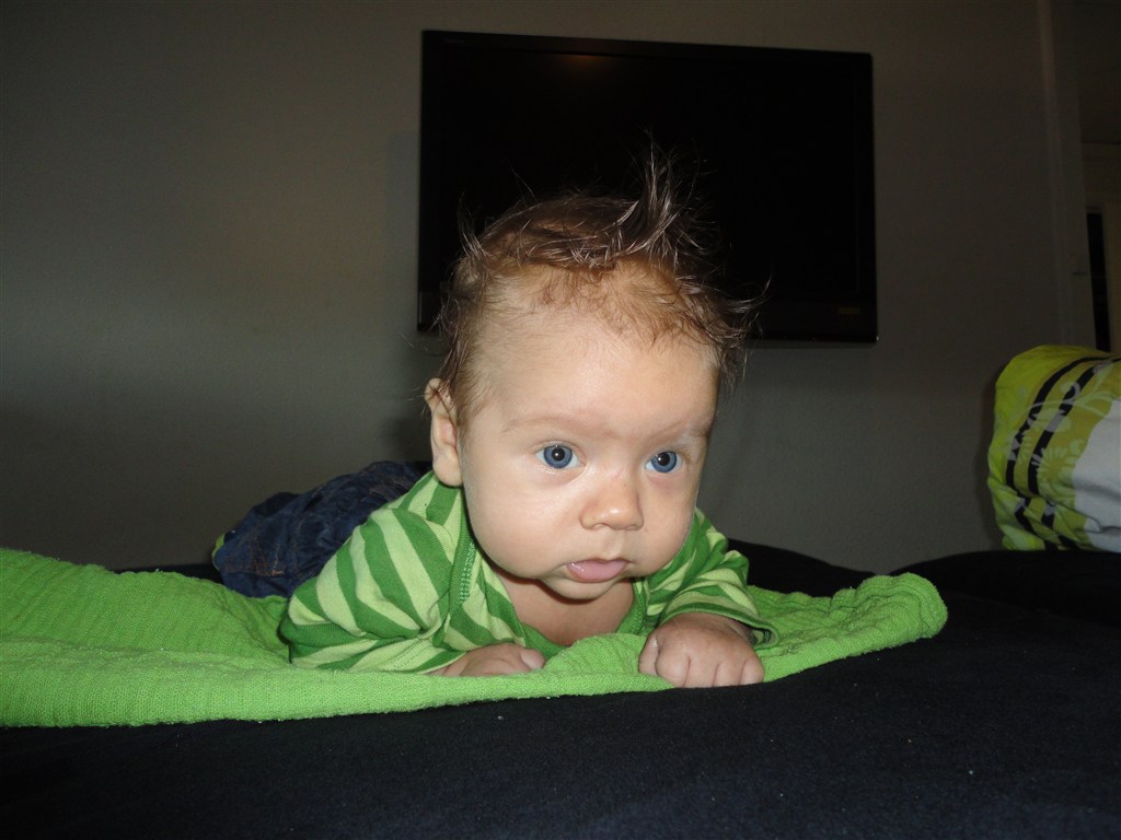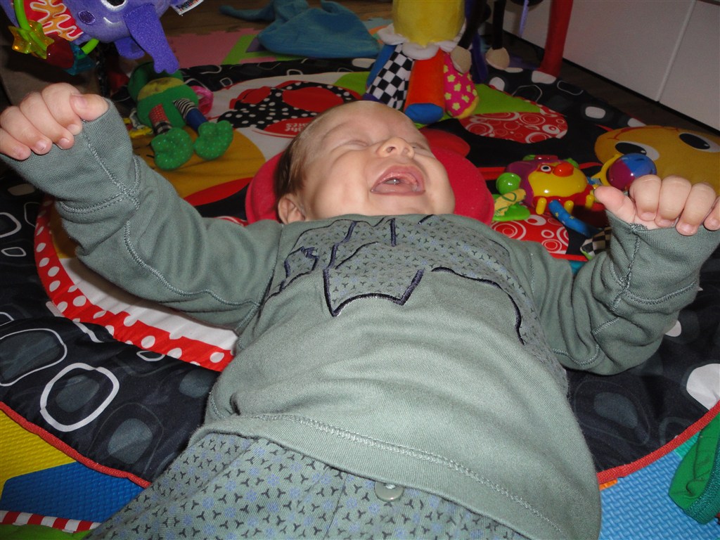 Nå men Lukas er en så dejlig og glad dreng! Han kan nu trille fra mave til ryg, og gør det gerne flere gange dagligt. Dog er det vidst stadig ikke heeeelt bevidst
