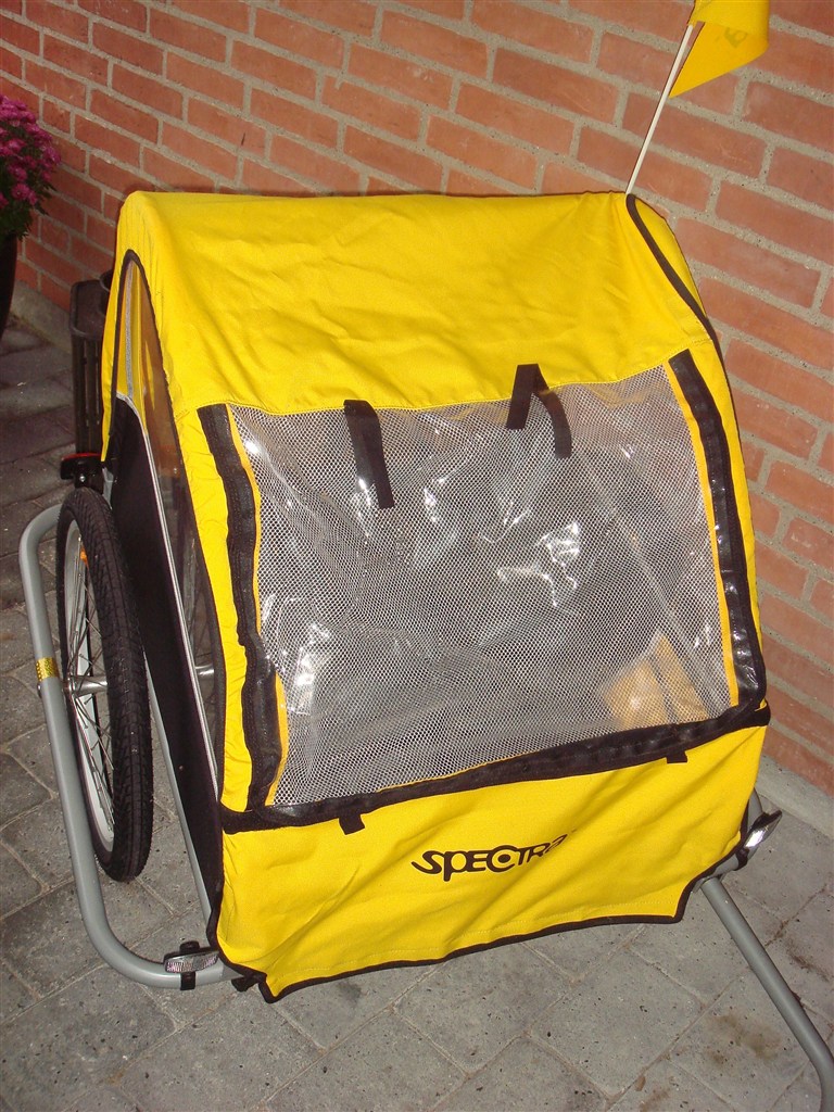 Rigtig lækker cykelanhænger fra Spectra (Kildemoes) sælges. Den er gul og til to børn. Den er kun få måneder gammel og brugt 4 gange. Fremstår som ny. Den sælges fordi vi simpelthen ikke får den brugt. Der medfølger to cykelbeslag.