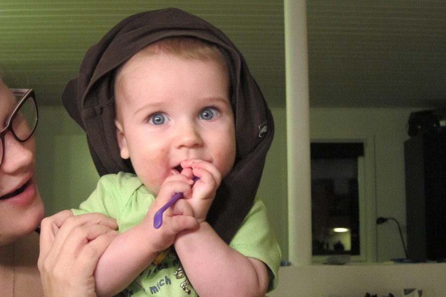 marius' mor skriver: Jeg gætter 6-7 mrd.. han har ingen tænder på billede 1 samtidig med at du støtter ham en del på billede nr 2..